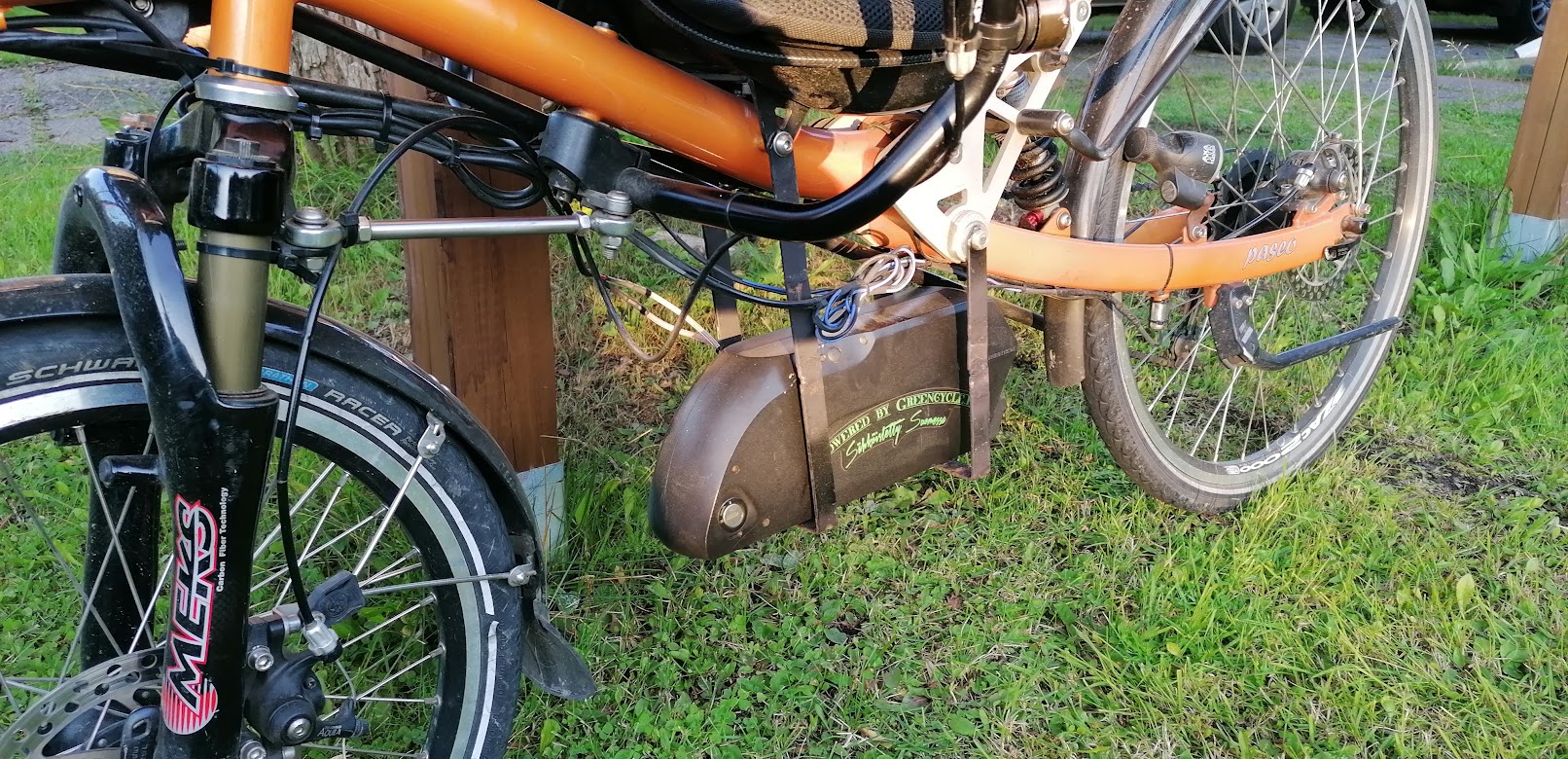 Tänks! Akku oli mulla alunperin puomin yläpuolella, mutta se meinasi kaataa pyörän jalustimelta. Alhaalla oleva akku vakauttaa kivasti pyörää, varsinkin kun moottori tuo painoa kampipuomin korkeudelle.