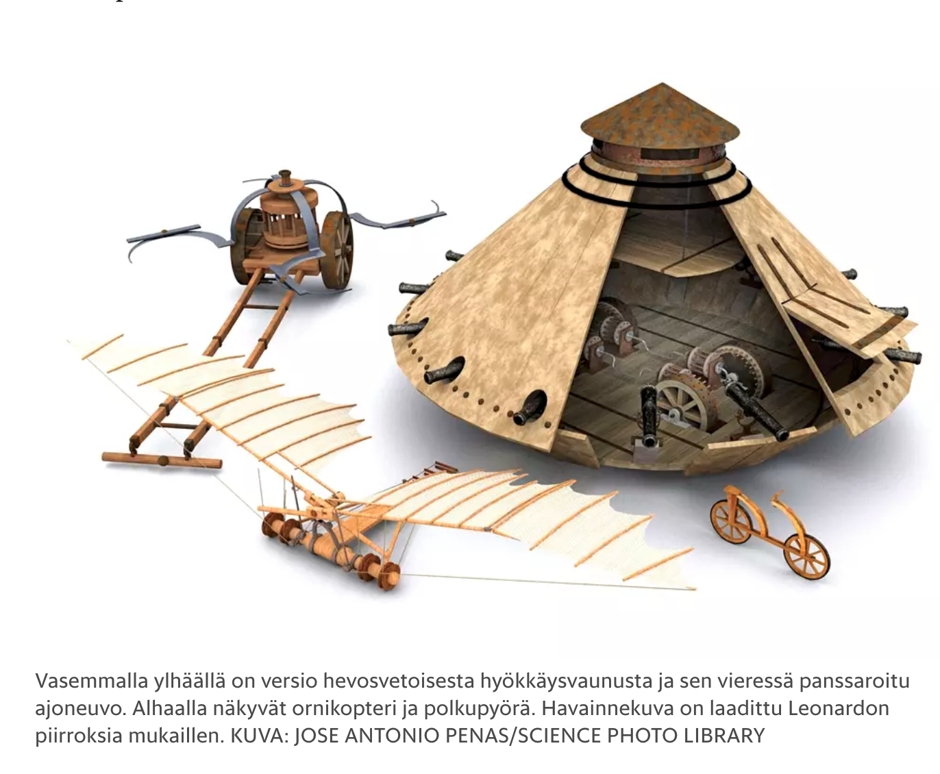 Tänään oli HS:ssa juttua Leonardon sotakoneista ja siinä mainittiin myös polkupyörä kuvatekstissä - jossa on mallinnettu suunitelmia. https://www.hs.fi/tiede/art-2000008198024.html