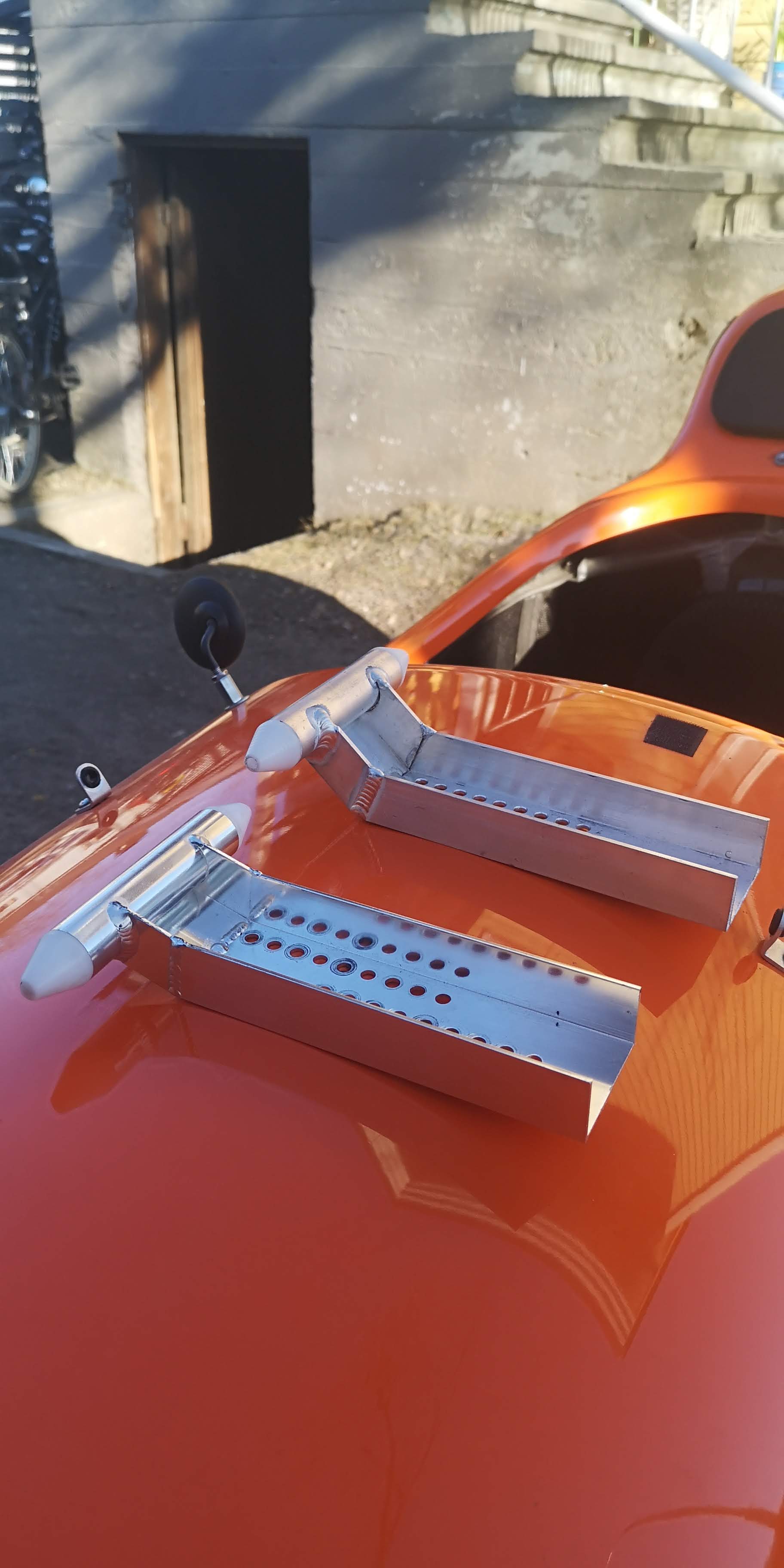 Kyselin Velomobieliltä tästä. Heiltä löytyy lyhytkasvuisille kuskeille kiinnike. Kuvassa oikealla. Vähän kallishan tuo on yksikseen hankittuna jos vertaa itse tehtävän adapterin kustannuksiin. Kattelen jos keksin jotain muuta tilattavaa tuolta niin voisi ottaa samaan pakettiin.