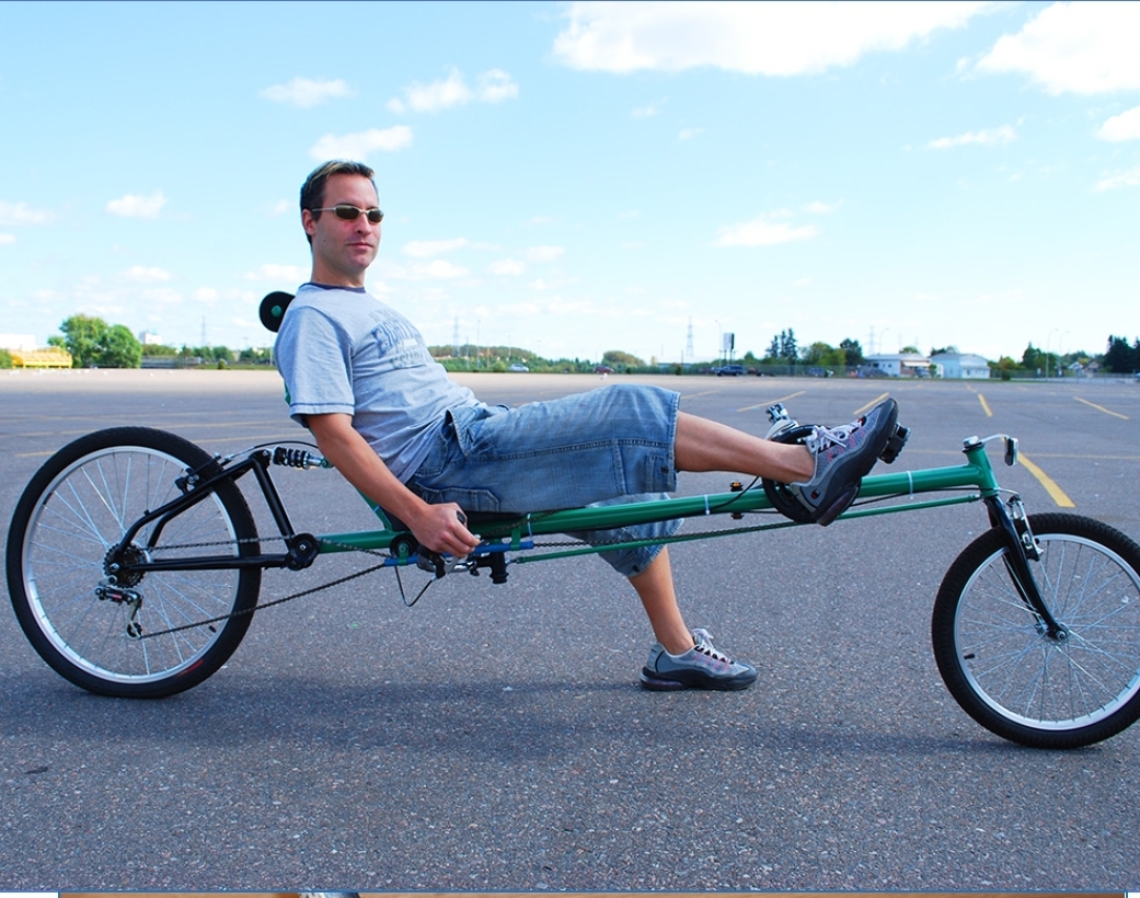 Ajattelin työmatkojen taittoon asfaltoidulla tiellä, kate olisi melkein kokonaan aukeava ja kallistus ja sen lukitus että liikkeellelähtö ja pysähtyminen olisi helpompaa. Jatkoin pyörää takaa että painopiste olisi hiukan lähempänä etupyörää ja jousitus taakse.