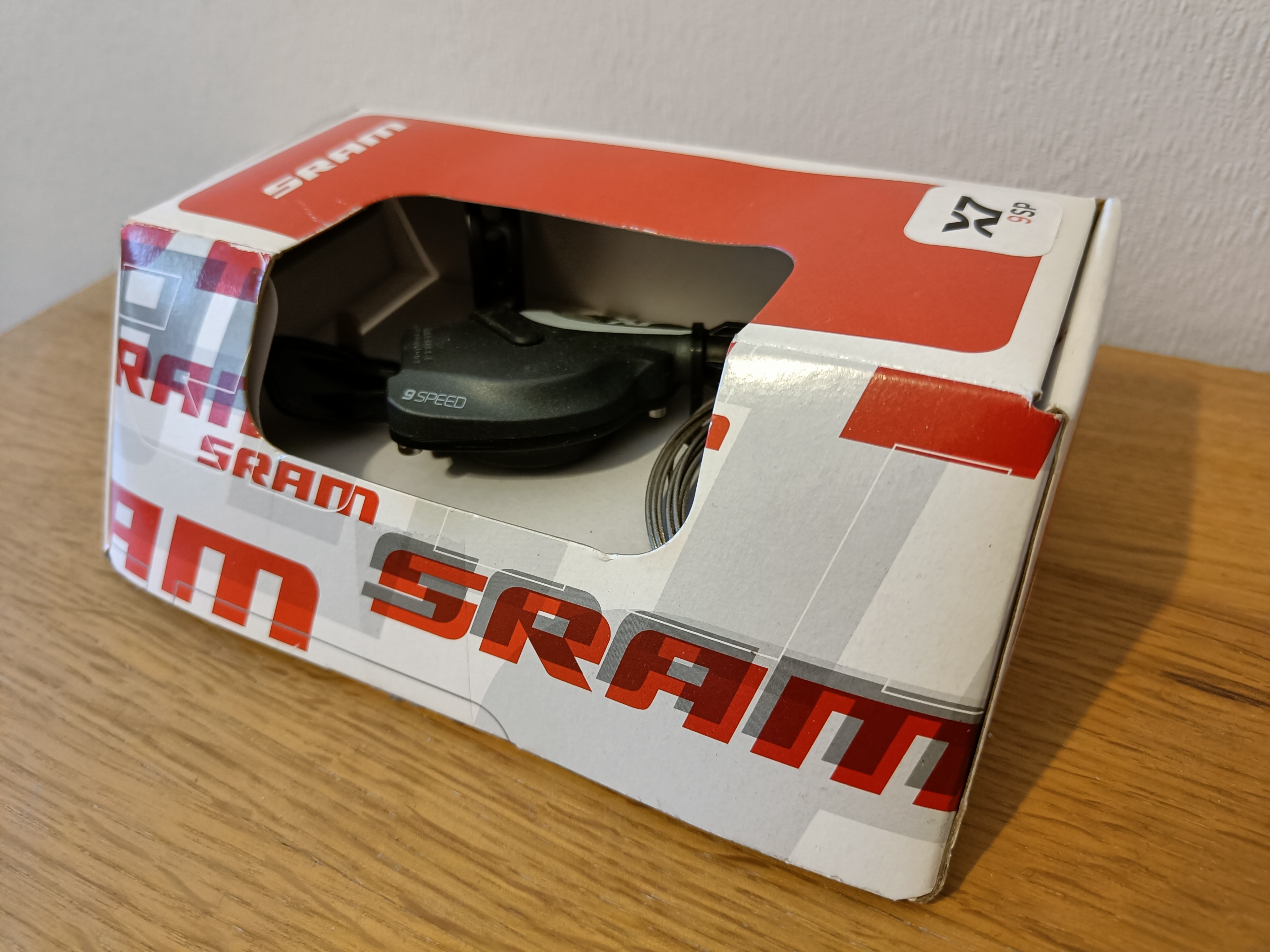 Käyttämätön SRAM x7 9-vaihteinen vaihdevipu avatussa paketissa, vipu on käyttämätön.