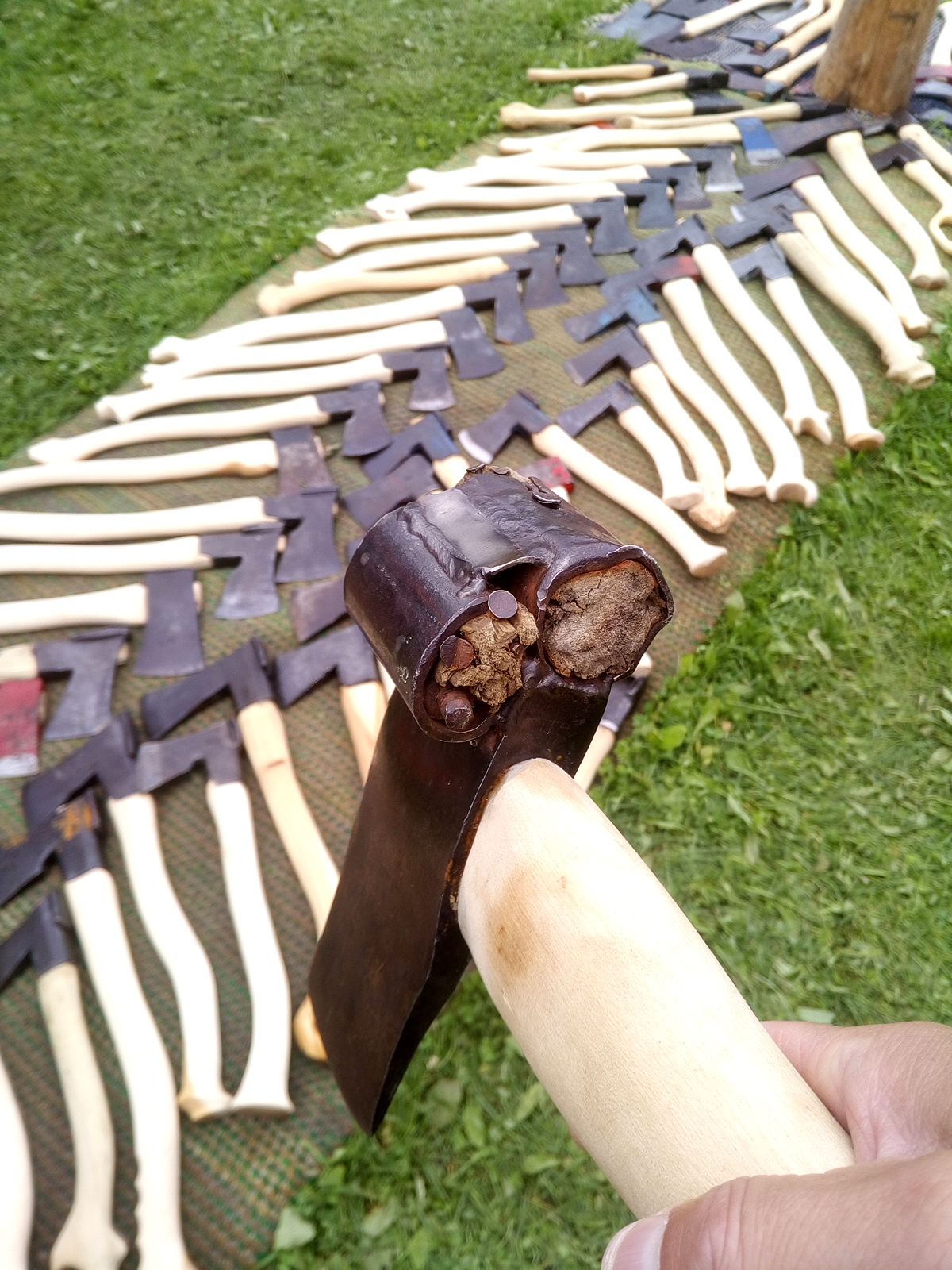 Kyläpäivillä kirveenvarrentekijällä on yksi, tuntemattomaan erikoistarkoitukseen tehty terä. Onko kollektiivisella tajunnalla valistunutta arviota tai peräti tietoa miksi terässä on kolme varren paikkaa?