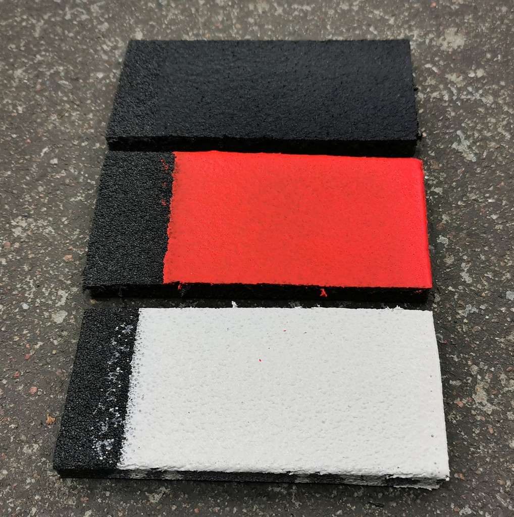 Siltä varalta että sopivan väristä solumuovia ei sattuisi löytymään, niin tein maalauskokeilun. Joustava materiaali vaatii joustavan maalin, joten kokeilin kumimaalia. Hyllystä löytyi valmiiksi mustaa väriä, jota suihkin pari kerrosta makuualustan palasen päälle. Toimivalta tuntui, joten kävin hakemassa kaupasta vähän iloisempia värejä (neon-oranssia ja valkoista):