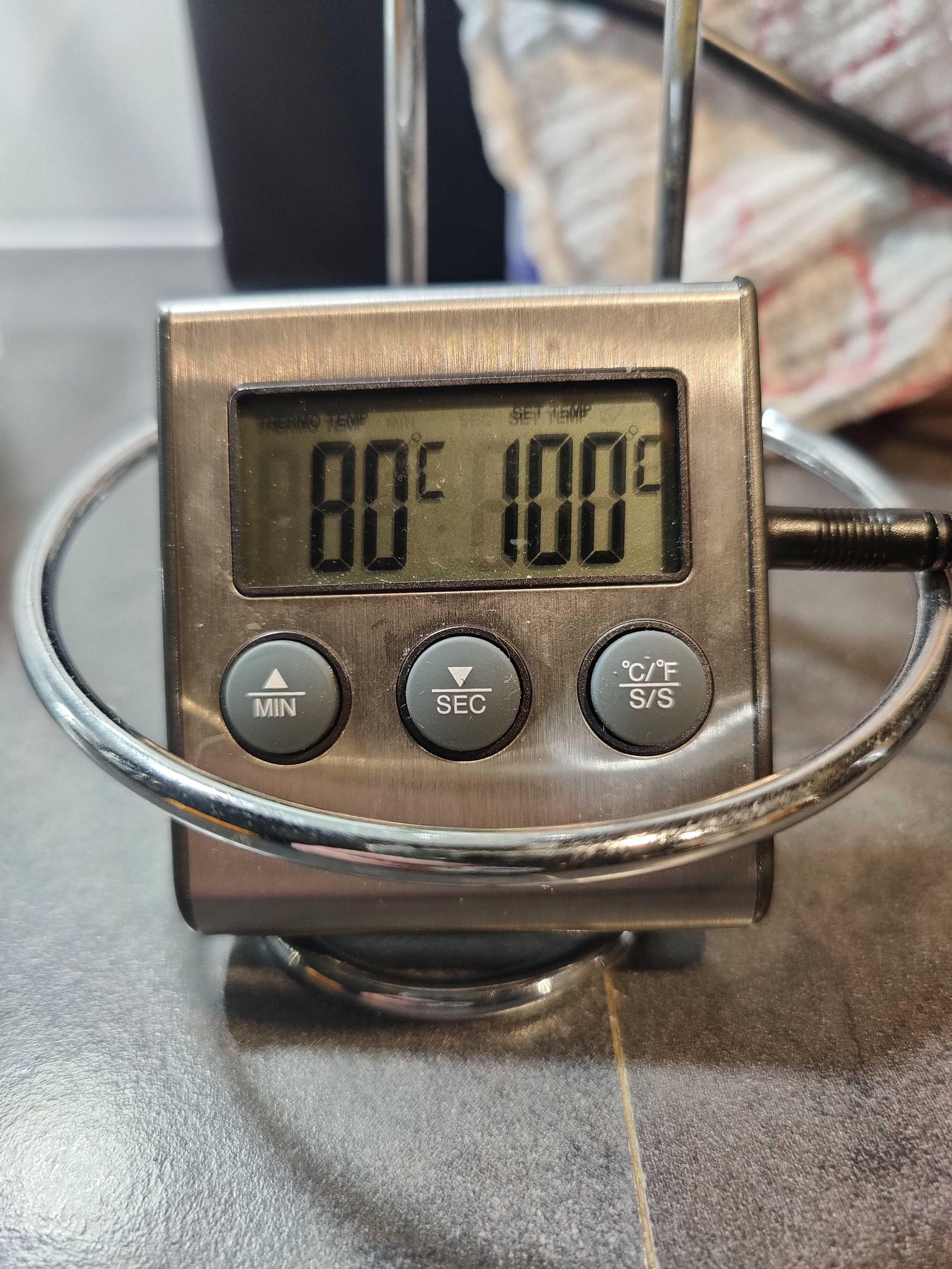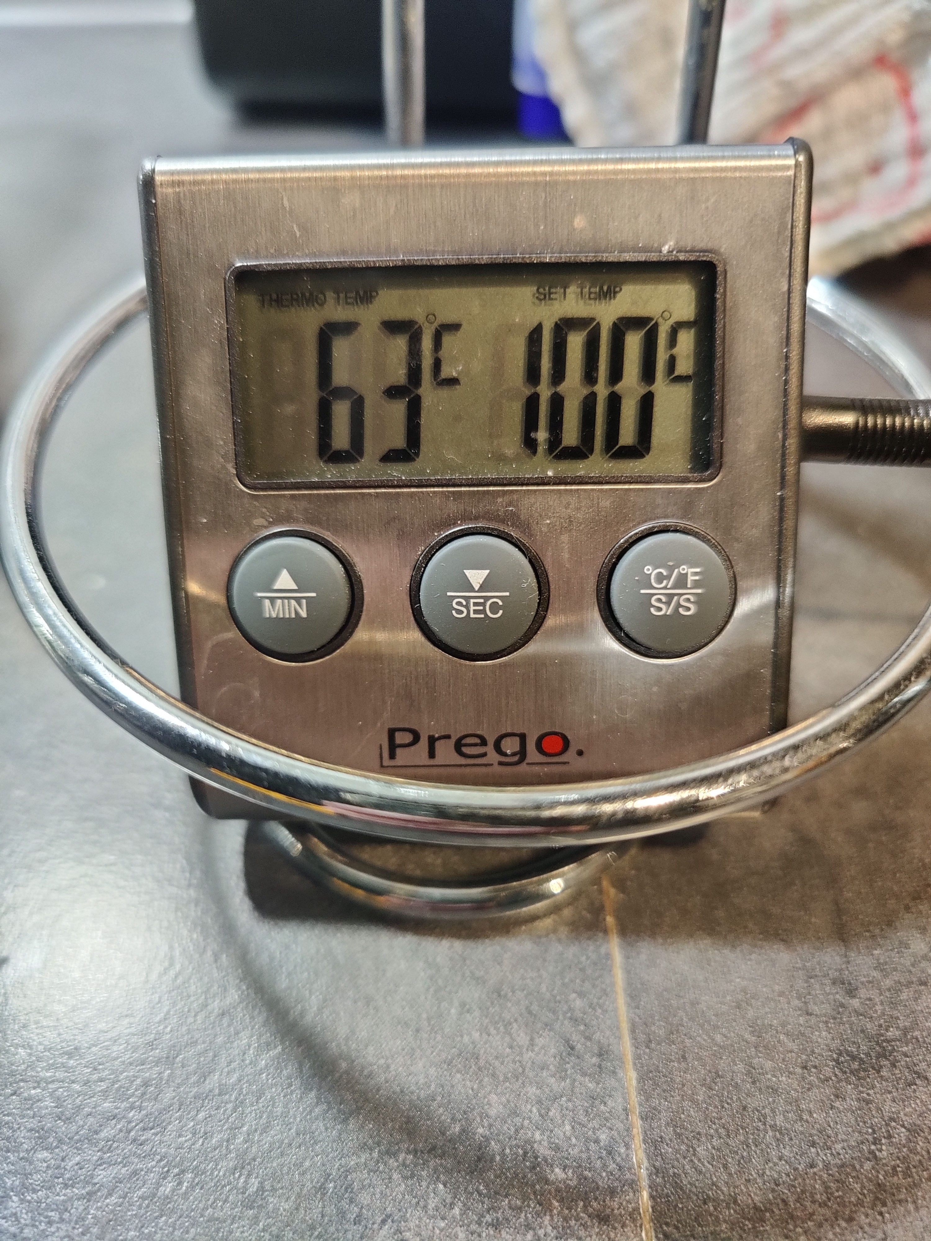 Lämpötilojen testausta. Kaadoin litran 61 asteista vettä pataan ja seurasin lämpöä tunnin.