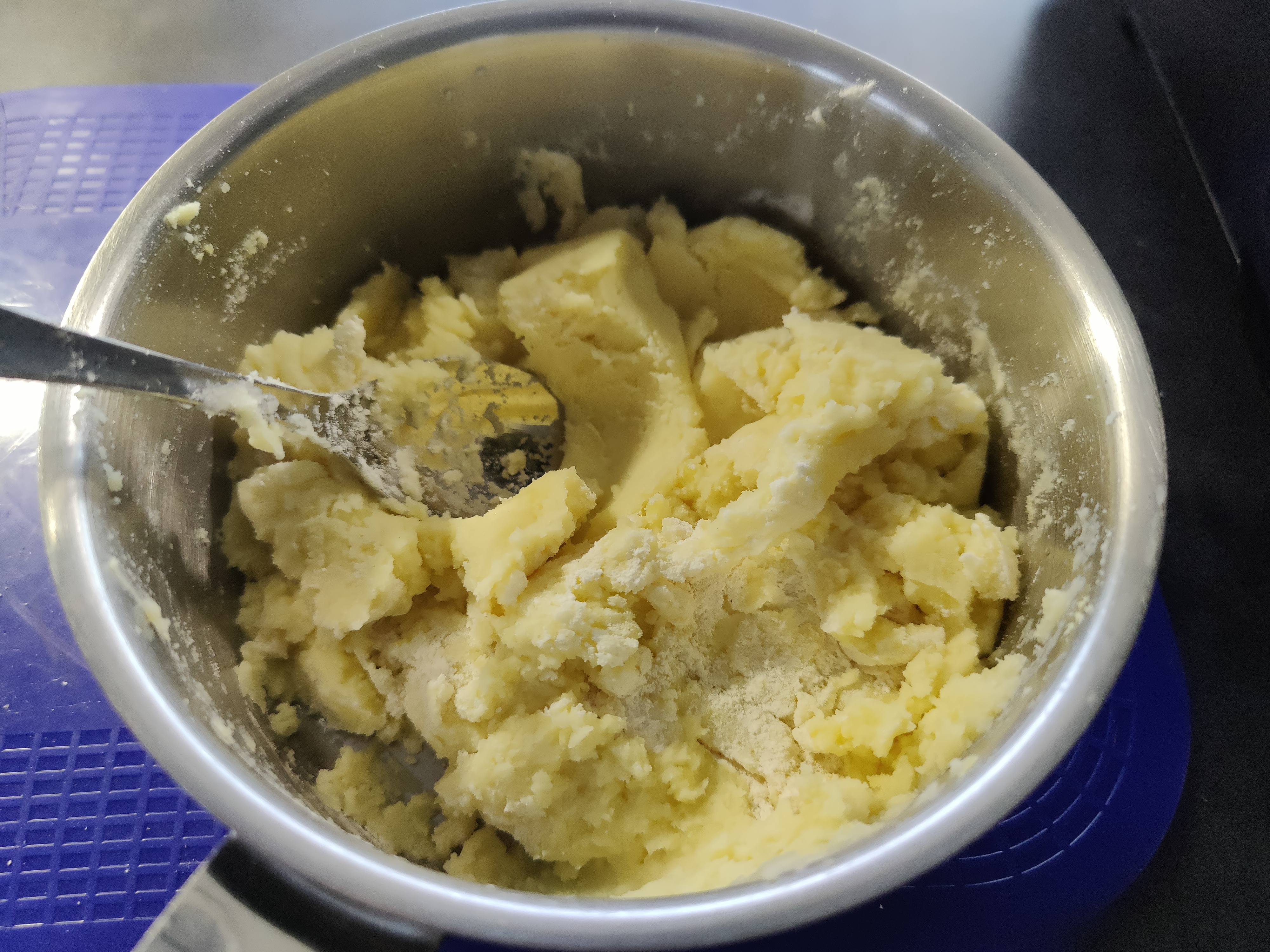 Perunat survotaan, sekaan hieman keitinlientä. Rakenne löysän ja paksun muusin väliltä. Jäähdytys alle 50 asteeseen ja puoli kourallista vehnäjauhoa sekaan.
