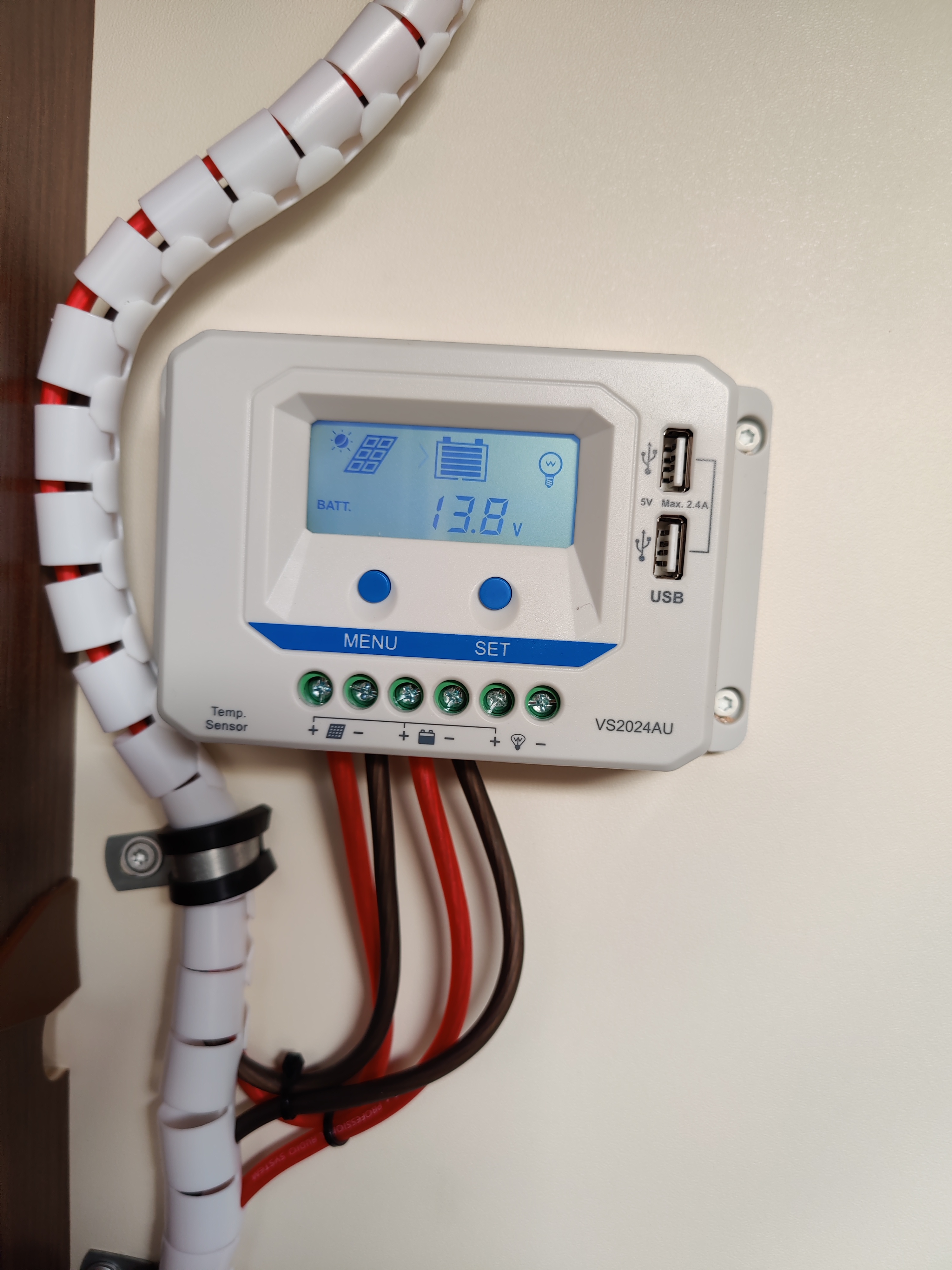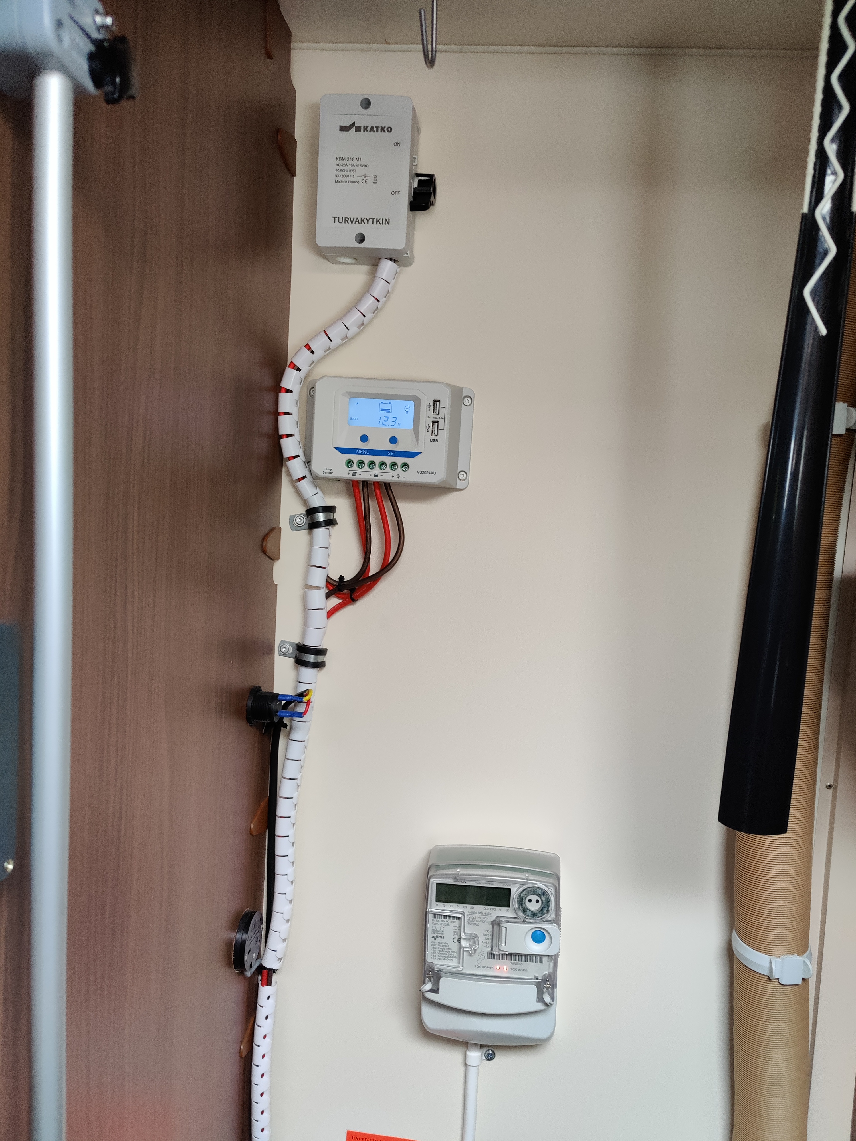 Aurinkopaneelisarjassa tuli mukana PWM museotekniikkaa edustava säädin. Vaihdoin tilalle nykytekniikkaa olevat MPPT säätimen, mikä on paremmalla hyötysuhteella ja siinä on myös litiumprofiili jo valmiina. Ja oli vielä hyvinkin kohtuuhintainen kivijalassa tuossa parin kilometrin päässä.
