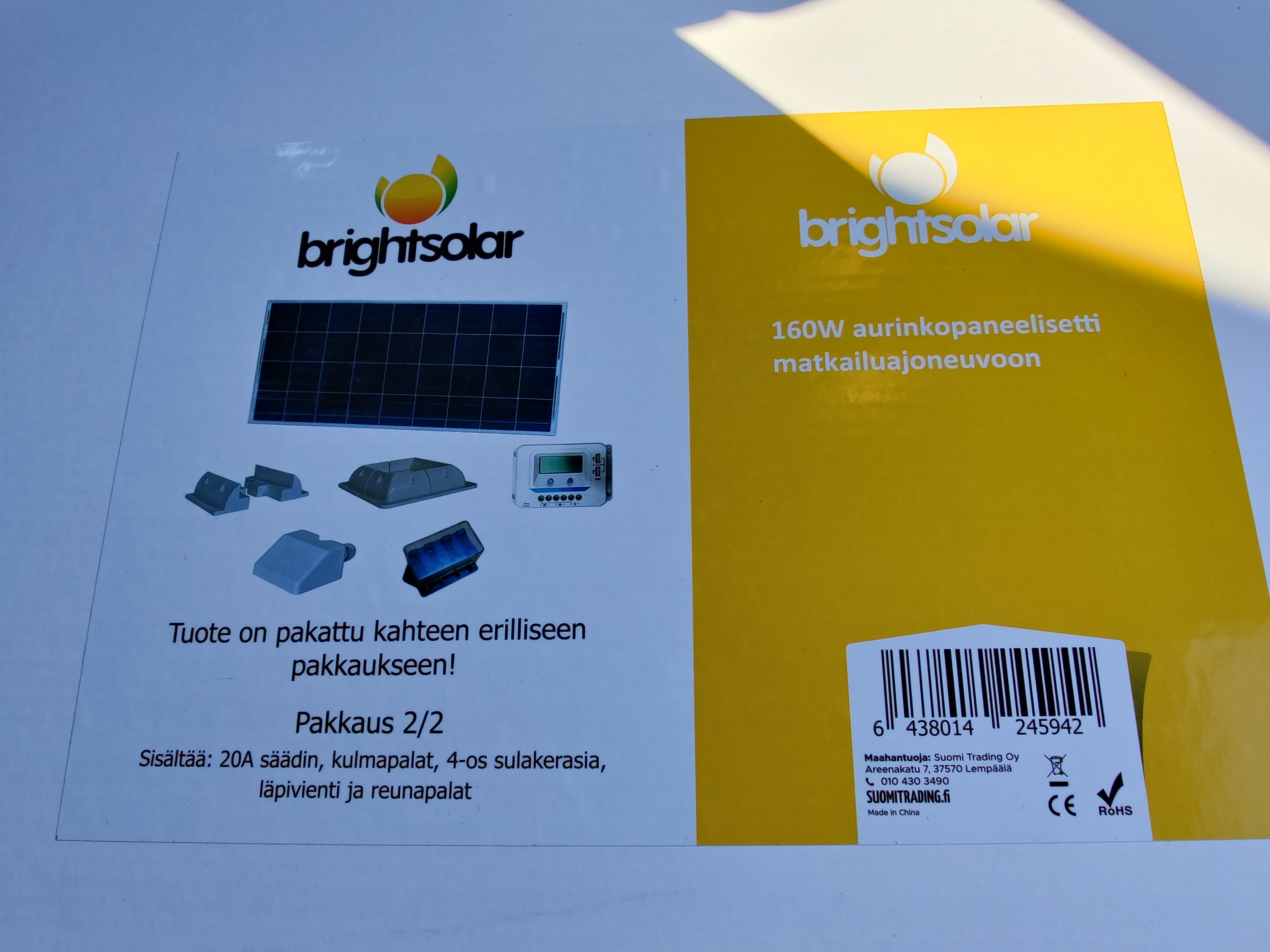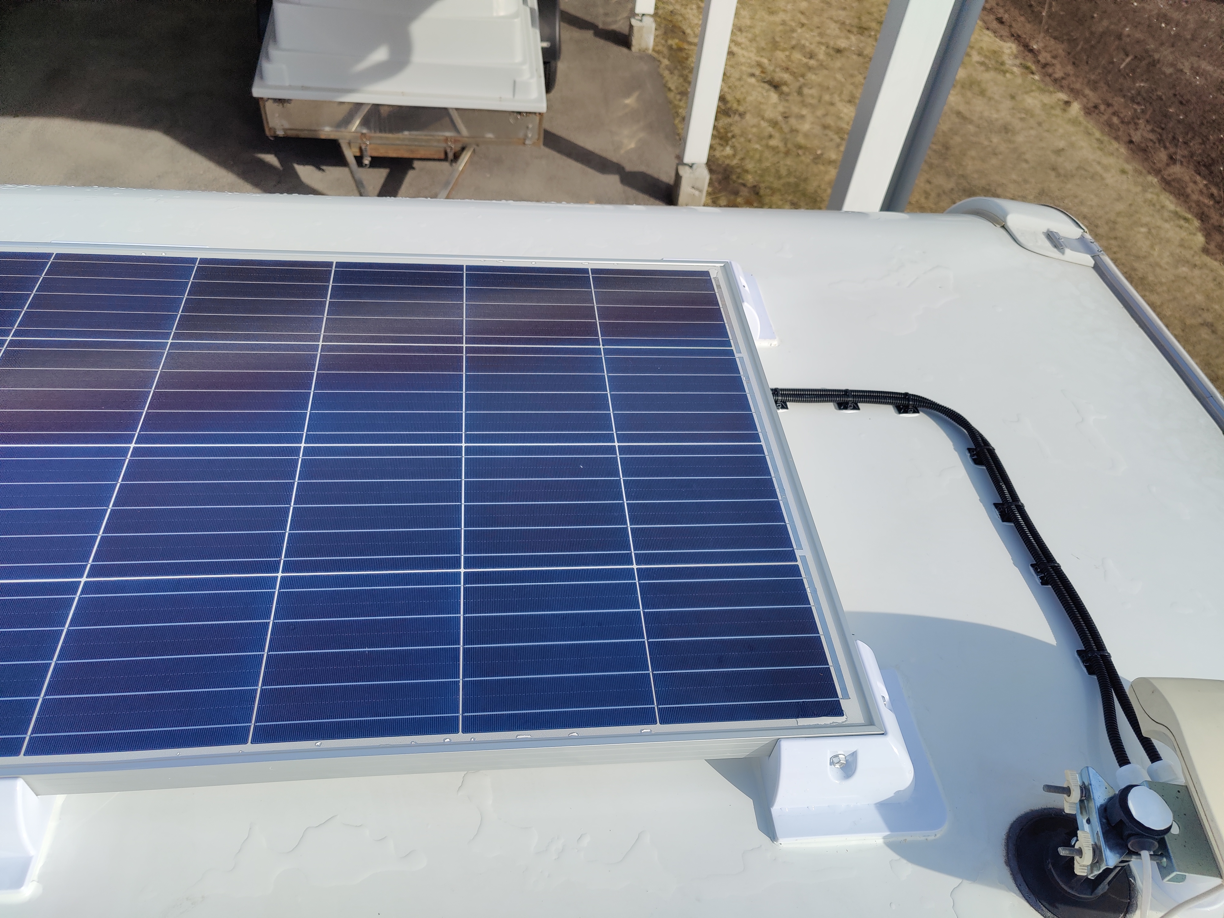 Tuo 160W paneeli taitaa olla sellainen "puolipaneeli". Ottamasi kuva on vähän liian läheltä, jotta hahmottuisi, millaisen tilan se vie vaunun katolla. Kokonaiset paneelit 320-400W ovat Wattia kohti selvästi halvempia, siksi kiinnostaa, olisiko sellainen mitenkään mahtunut tuohon katolle. Päättelin tuosta tekstistäsi, että sinulla on nestekaasujääkaappi. Jotkut ovat menestyksekkäästi käyttäneet veneessä pienempääkin aurinkopaneelia ja saaneet sillä toimimaan myös kompressorijääkaapin, mikä siis kesähelteellä tuottaa sisälle vähemmän ylimääräistä lämpöä kuin vastus-/kaasukaappi.