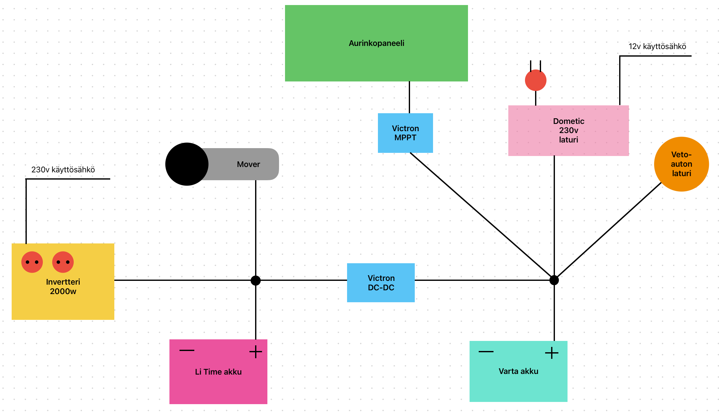 Ensimmäinen pääakku on 12v ja 100ah, tällä käytetään 12v järjestelmää. (valot, vesipumppu, wc huuhtelu, tv, liesituuletin, jäähdytys/lämmitys puhaltimet, tupakansytytinlaturit kännyköille sekä tableteille)