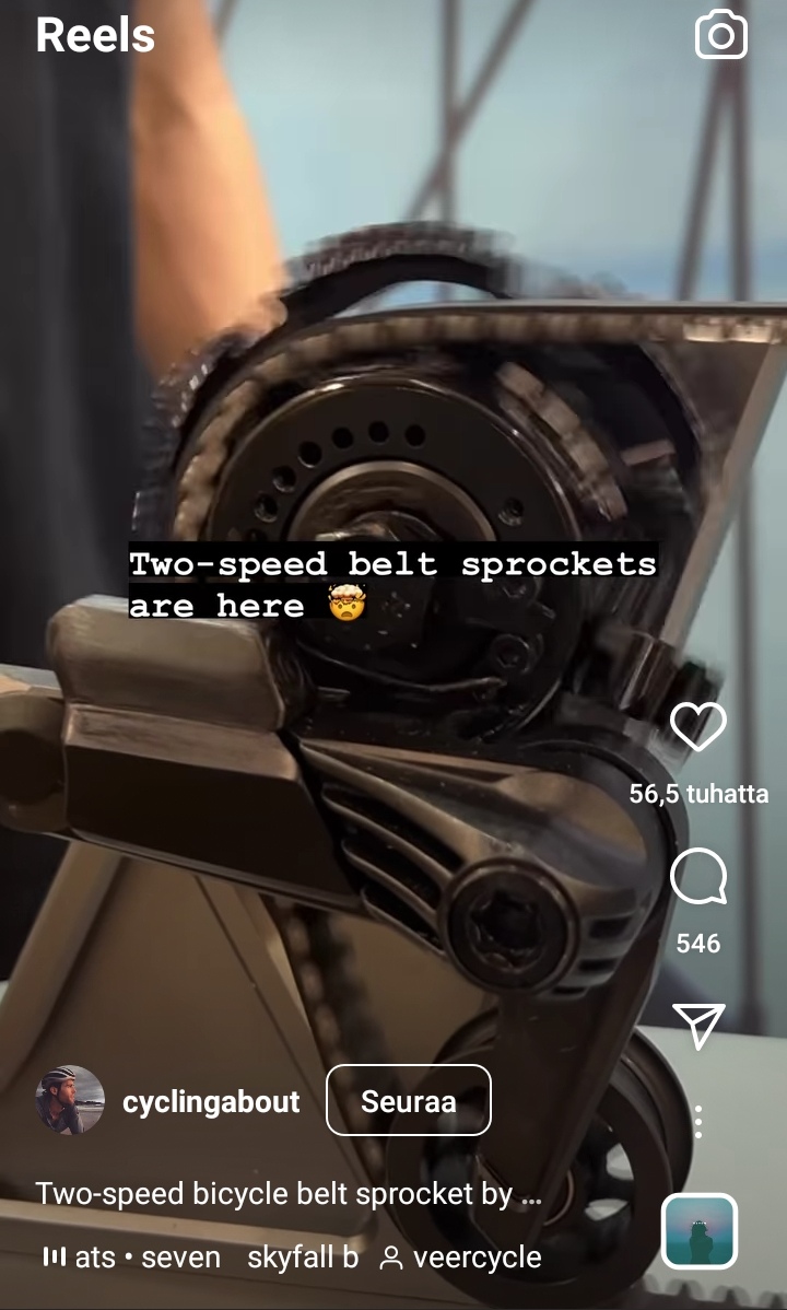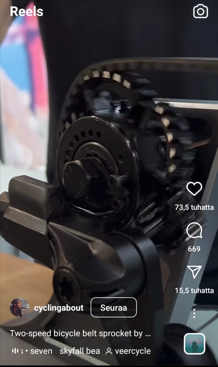 En tiedä instagrammeista, enkä muutenkaan tästä tuotteesta, mutta tuollaista hihnaa ei saa toimimaan kuin linjassa, joten ainoa keino vaihtaa vaihdetta kahdella eri kokoisella hihnapyörällä on laittaa kaksi hihnapyörää samalle akselille rinnakkain myös hihnan toiseen päähän. Tällainen hihna on sivusuunnassa niin jäykkä, ettei pysy päällä, jos veto on vähänkin vino. Tätä ominaisuutta on sitten hyvä käyttää vaihtajan toiminnassa. Vaihtaja siis työntää hihnan ensin pois isommalta hihnapyörältä, sitten työntää hihnan toisen pään sen pään isommalle pyörälle, jolloin hihna kiristyy aloittaneen pään pienemmälle hihnapyörälle. Hiihna siis vain vaiheittain suuntaissiirtyy toiselle hihnapyöräparille. Kahta vaihdetta varten tarvitaan siis neljä hihnapyörää.