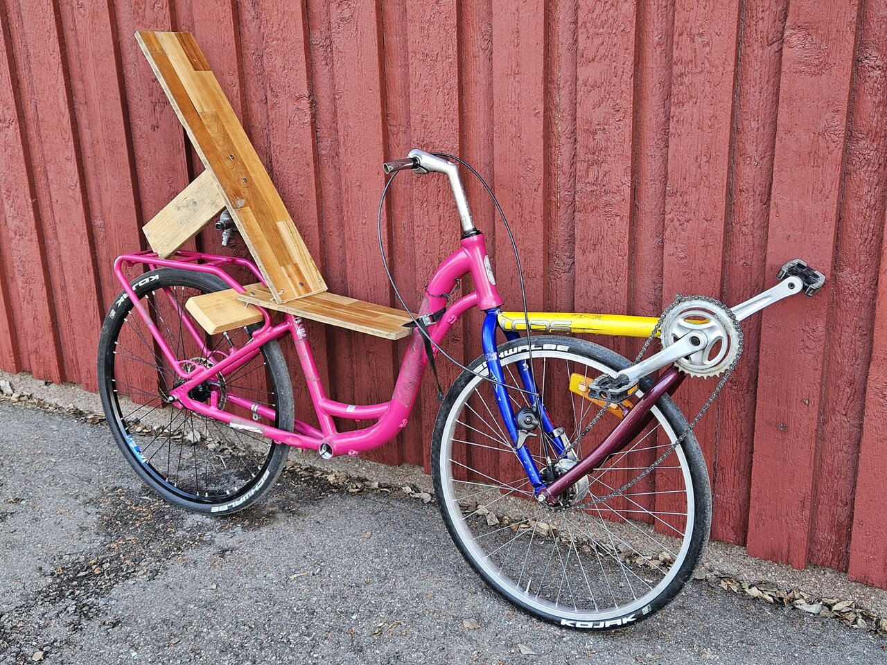 Poljinpuomi vaihdettu että polkimet tuli ehkä 15cm alemmaksi. Selkänoja nostettu pystymmäksi.