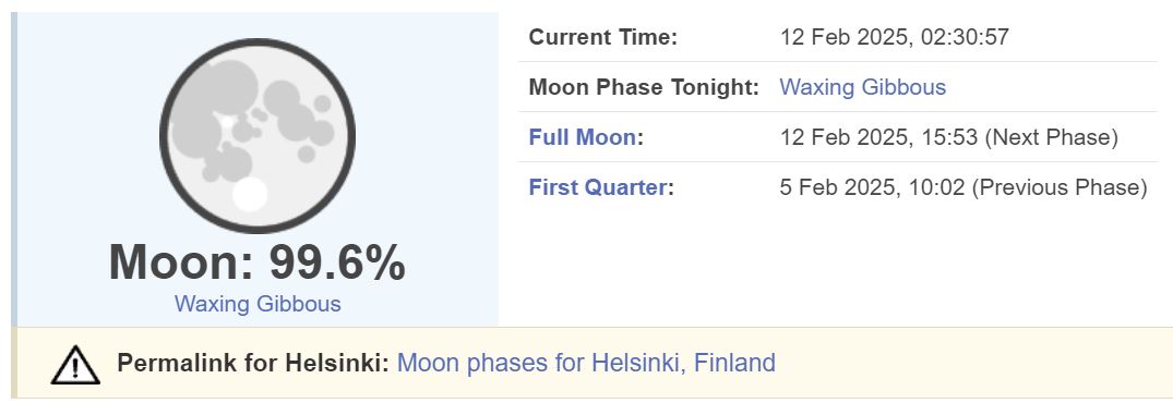 jori kirjoitti: 12 Helmi 2025, 20:05Täysikuu tarkoittaa, että kuu on maan varjon puolella aurinkoon nähden.