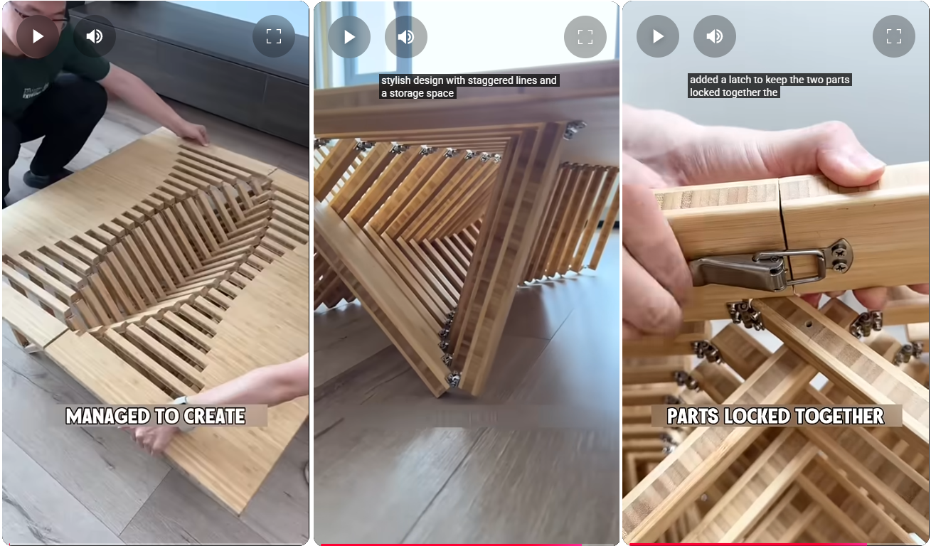 Tästä sälesaranapöydästä en löytänyt kuin tällaisen ärsyttävän lyhytvideon, mutta parempi sekin kuin ei mitään. Tämä on sitä nerokkuutta, jota tarkoitan tuossa yllä. Levy käytetään kokonaan kapeita sahauksia lukuun ottamatta. Pöytä menee täydellisesti levyksi, mutta nousee tukevaksi, kauniiksi pöydäksi nostamalla ja lukitsemalla puolet yhteen. :D