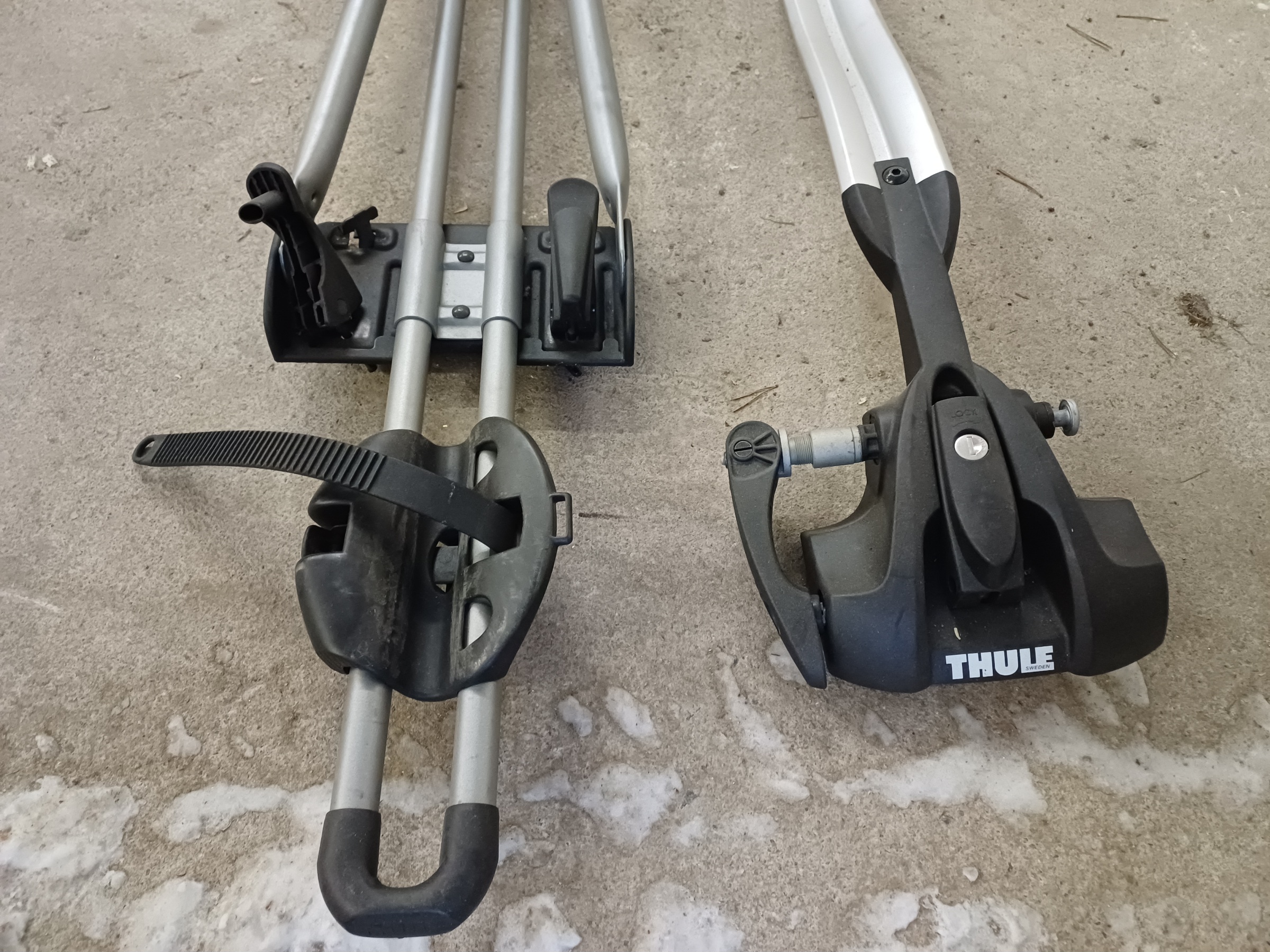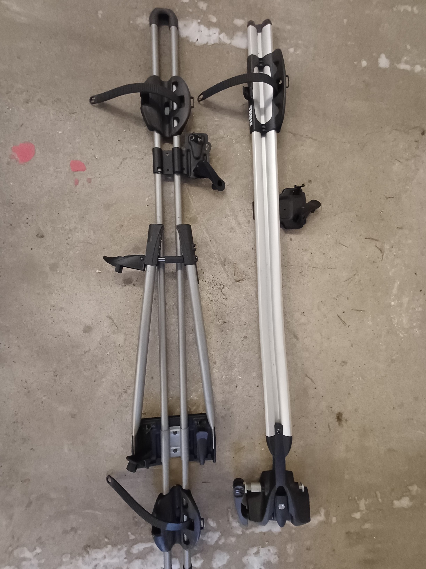 Myynnissä kaksi erilaista Thulen pyörän kuljatustelinettä. Molemmat kattotelineisiin kiinnitettäviä. Toisessa pyörän kiinnitys runkoputkesta, toisessa etuhaarukasta.