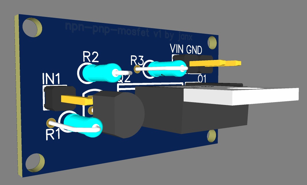 Komponentit lähti tilaukseen (mosfetit). Piiri sai muotonsa versiossa yksi. Voin suositella EasyEdaa, jos elektroniikka kiinnostaa. Ei löytynyt pienellä kytkentävastuksella muuta kuin "isolla" TO-220-kotelotyypillä P-kanavainen mosfetti.