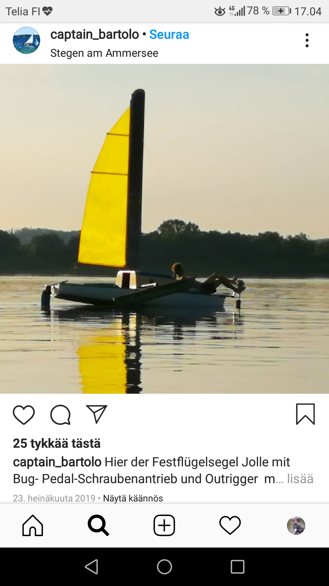 Instassa tuli vastaan toinenkin kinneristi purjehdusharrastuksen parissa. Tyylilleen uskollisena, varmaan itse rakentanut polkuavusteisen purjeveneen. Instagramin hakusanana #meufl.