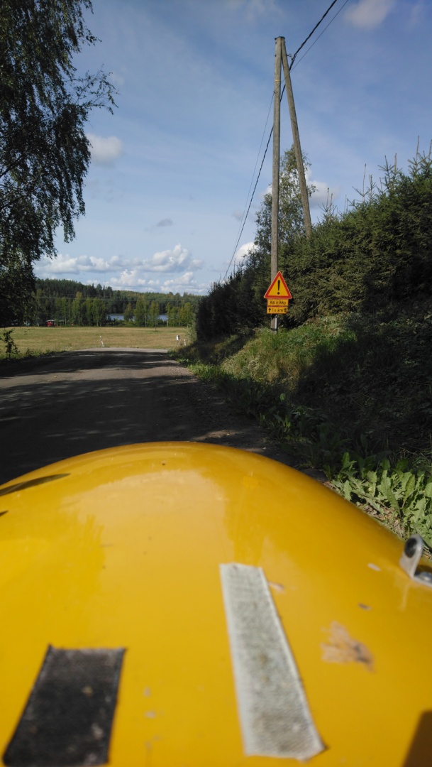 7 km jälkeen soratielle, taas ylämäki-alamäki-ylämäki yhdessä polkien, tai kahdessa mäessä työnsin, toisessa myös vähän Sailaa ettei matka toppaa ja pääsi mäen päälle. Pito ei tahdo riittää irtosoralla ja oli nuissa jyrkkyyttä vaikka lyhyitä mäkiä. Helposti olisi päivän maksiminopeudet saanut soralla, ehkä 70 kmh mutta pää ei kestänyt kuin 50 kmh kyytejä.