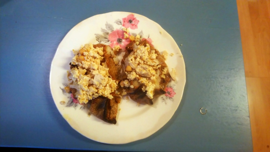 Kikherneet muussasin lusikalla, kuutioin tofun ja sekoitin ne margariinin kanssa. Suolaus ja roiskin joukkoon basilikaa kun ei muita yrttejä ollut käsillä, pitää varmaan kesällä viljellä :)