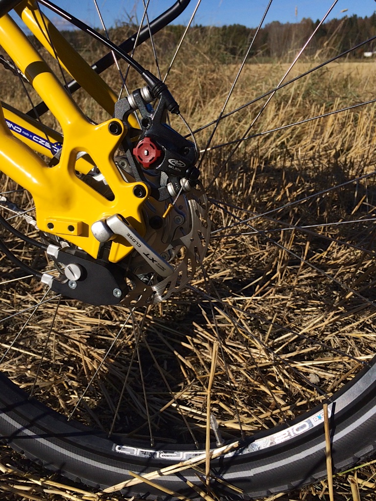 Ostin runkosetin ja kasasin itse, siinä säästi noin 400€, vaikka jotkut osat tuli parempia kuin valmiina ostetussa... Osiksi pyörään valikoitui seuraavaa. Jarrut Avid BB7, kahvat Avid Speed Dial. Vaihteisto Rohloff, rungossa Rohloff OEM yhteensopiva haarukka, tulipa siisti asennus :) Takaiskari Fox Float CTD, etuiskari RockShox SoloAir TK30 Gold. Kammet Truvativ Elita 147mm teräksisellä hammasrattaalla. SON napadynamo ja Edelux lamppu edessä, Busch-Muller takana. Vanteina Ryde Andrat. Renkaat Schwalbe Marathon Mondial. Penkki Azub normipenkki. Tavaratelineet neljälle laukulle.