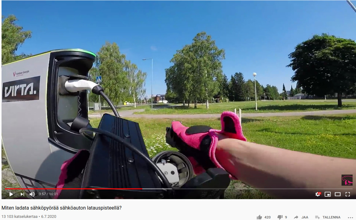 BossManaatti (Youtube) oli saanut ostettua adapterijohdon, jolla sähköpyörää voi ladata sähköautonlatausasemasta.