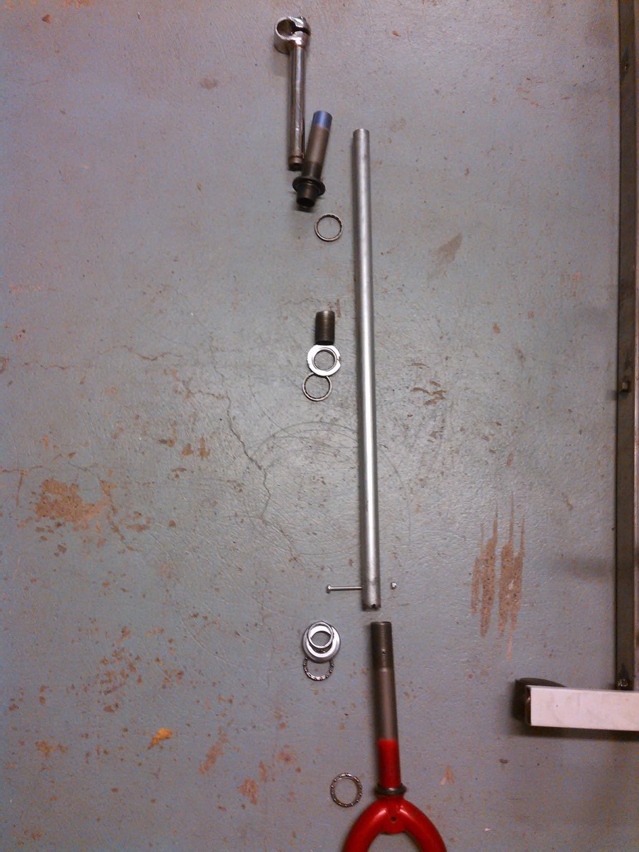 Haarukan kierteeseen on upotettu putkisokka. ohjausakselin hahlo ottaa siihen kiinni ja 5mm ruuvi lukitsee paikoilleen.