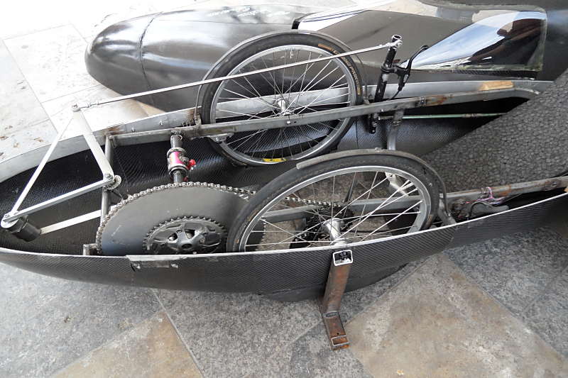 Hyvä pelihän tuo muuten on ja tuo on tulevaisuuden kinnerien rakenne. Vasen eturengas vetää ja tarpeen vaatiessa myös oikea eturengas. Molemmat eturenkaat ohjaavat suunnanpito-ohjausta noin asteen liikkeillä ja ketteryysohjaus on takana. Eturenkaat voivat olla suuremmat, kun eivät käänny kuin hitusen ja ne voi kattaa molemmin puolin samasta syystä. Takapyörä voi olla pieni, kun siellä on vain vähän painoa, eikä vetoa, joten sille on helppo toteuttaa suuria kääntökulmia ja saada aikaan ketterä kulkine. Polkimet vaativat kampiakselin, muuten tuo on yksinkertainen. Se suunnanpito-ohjausmekanismi etupyörille on vielä vähän kesken, mutta tekeillä. ![]()