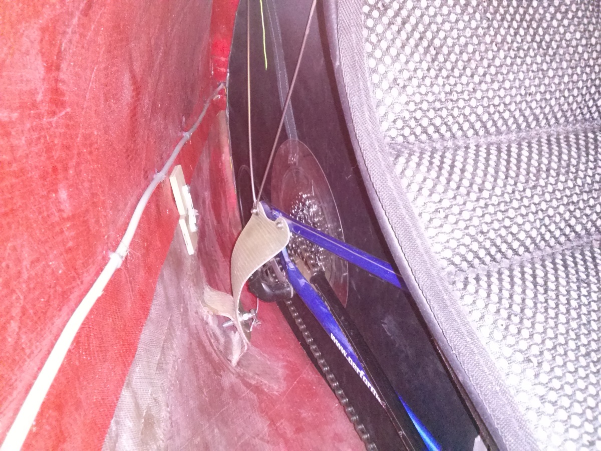Tuulilasin takana on hyvin tilaa ja lyhyelle kuskille penkkiä voitaisiin siirtää eteen ja ylöspäin. Polkimia saa vielä n. 5cm eteenpäin ja nykyisellä kopalla tilaa lienee ainakin 185-190 pitkälle kuskille. Kinneriin saisi suht helposti korkeutta lisää laittamalla ylä- ja alakuoren väliin muutaman sentin suikaleen, jolloin tulisi päälle ja polville lisää tilaa. Pyöreällä keulalla saisi polkimia vielä muutaman sentin edemas. Noilla muutoksilla mahtuisi parimetrinenkin mies tai nainen kyytiin.