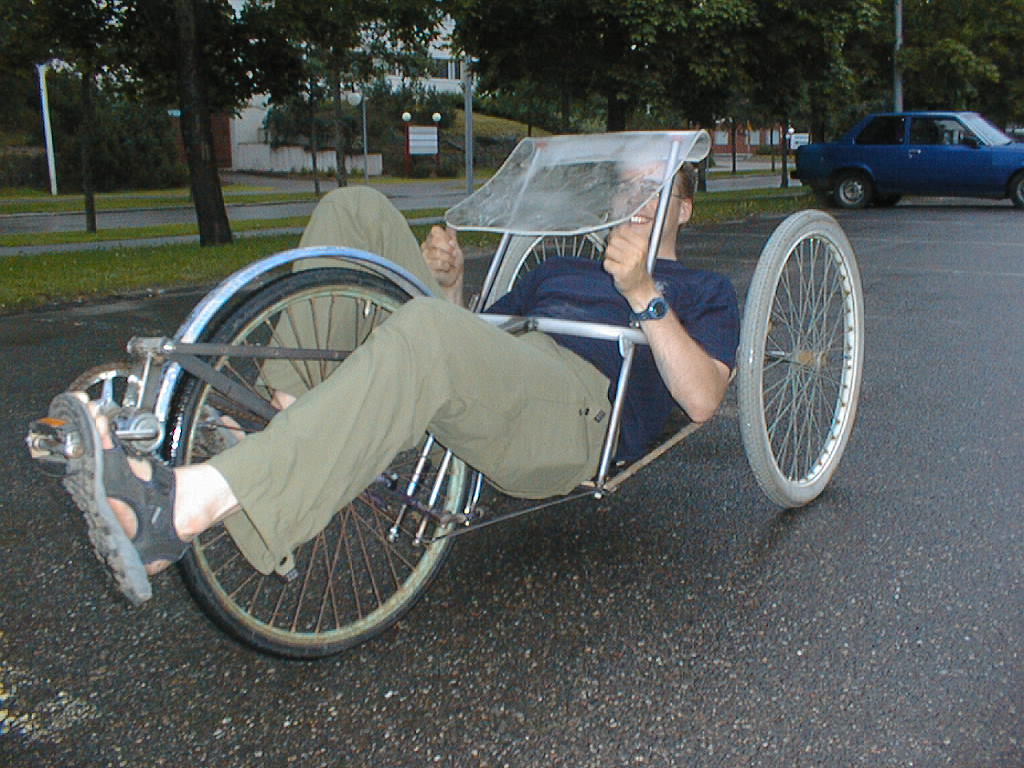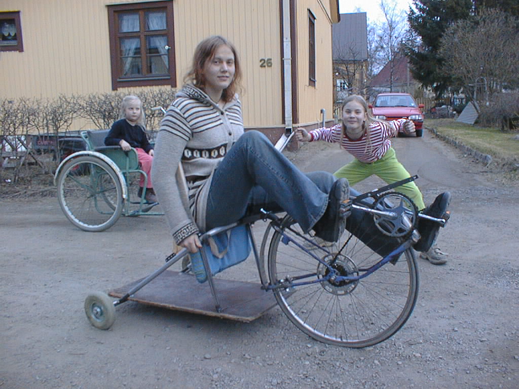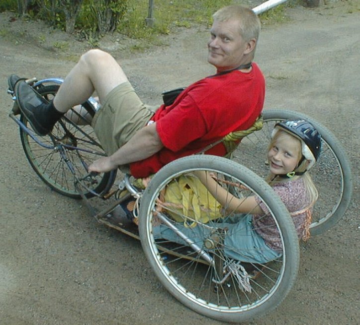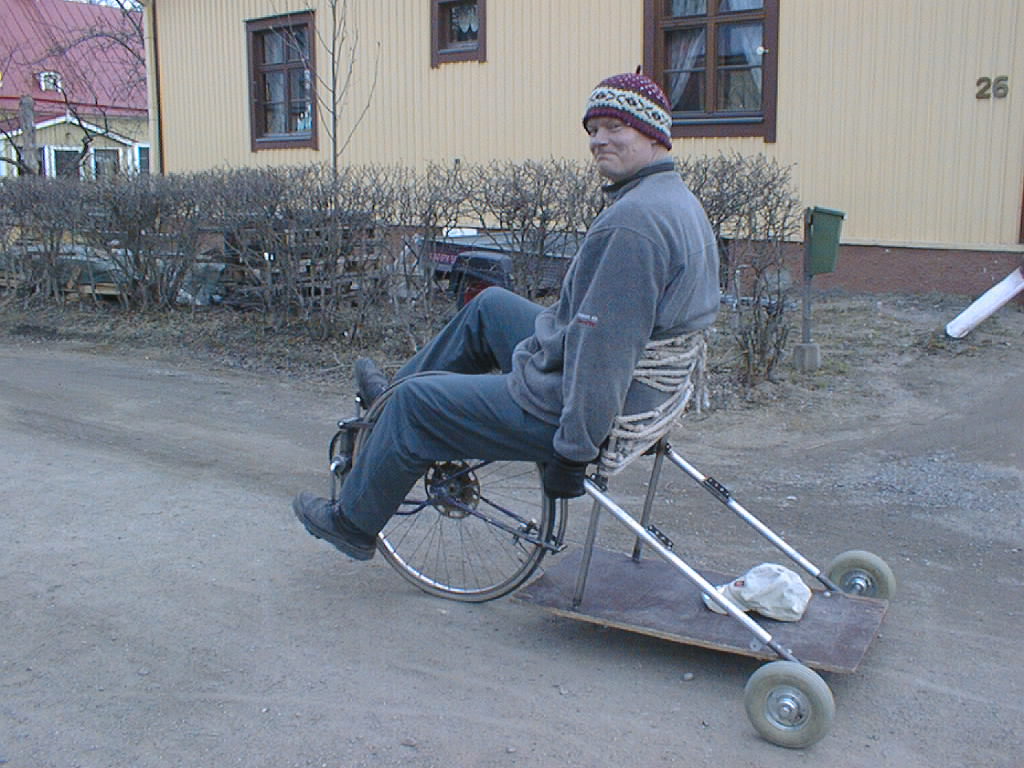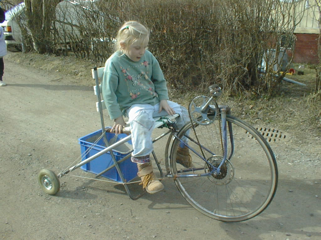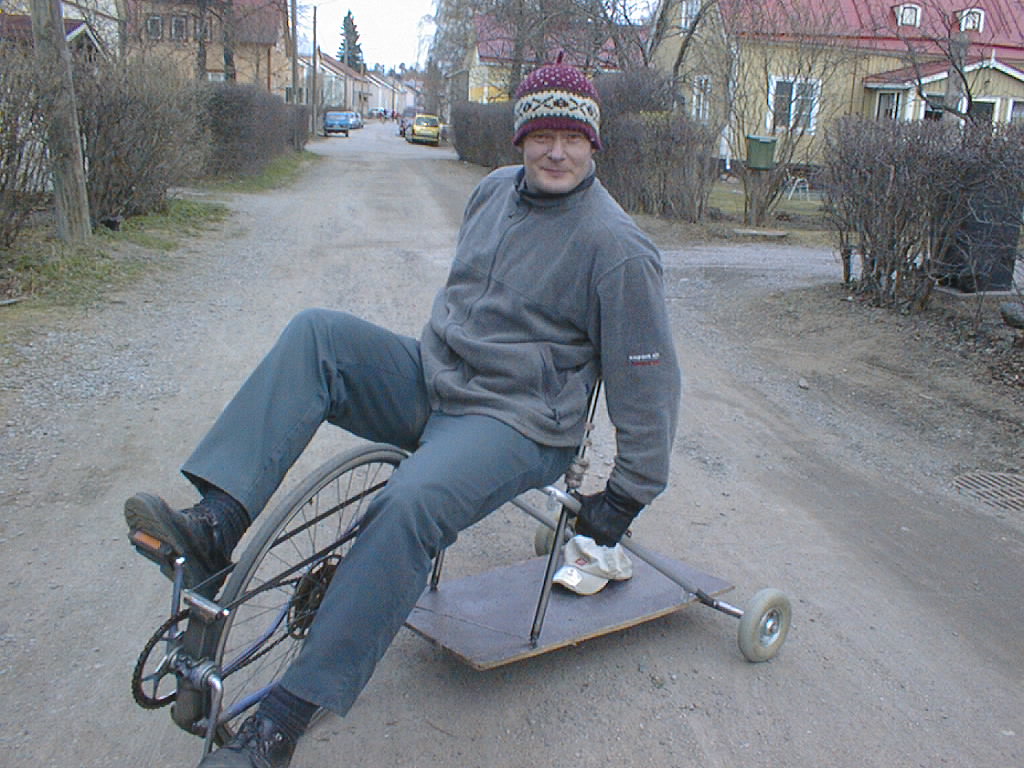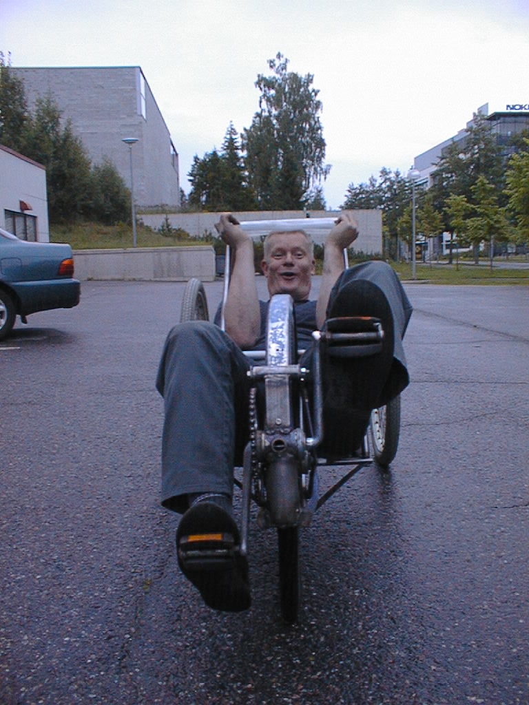 Rakensin sille runko-ohjatun virtuaalinivelellä varustetun etuveto deltan. No, siinä rakentamisessa meni kuitenkin niin kauan, että iskias ehti parantua ja pyörä jäi minulle. Se oli siihen aikaan erinomainen väline kuljetella kakaroita uimarannalle, päiväkotiin tai viimein kouluun.