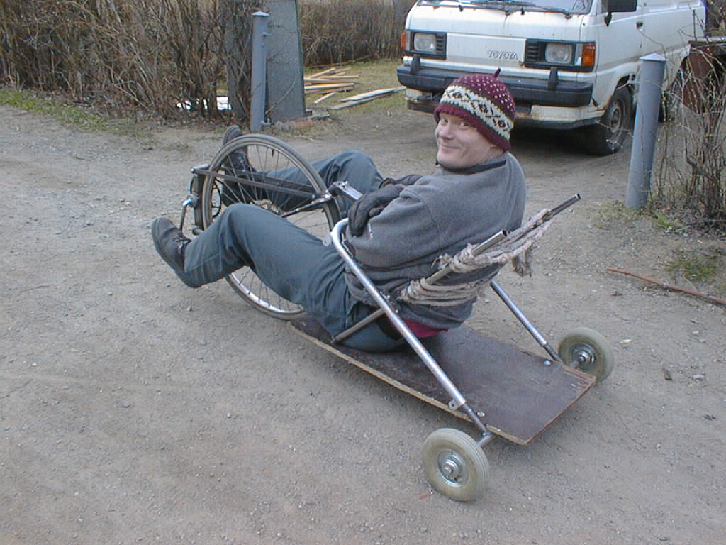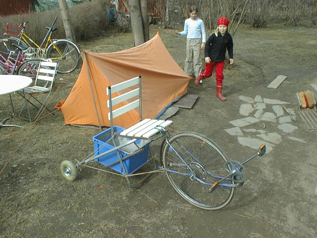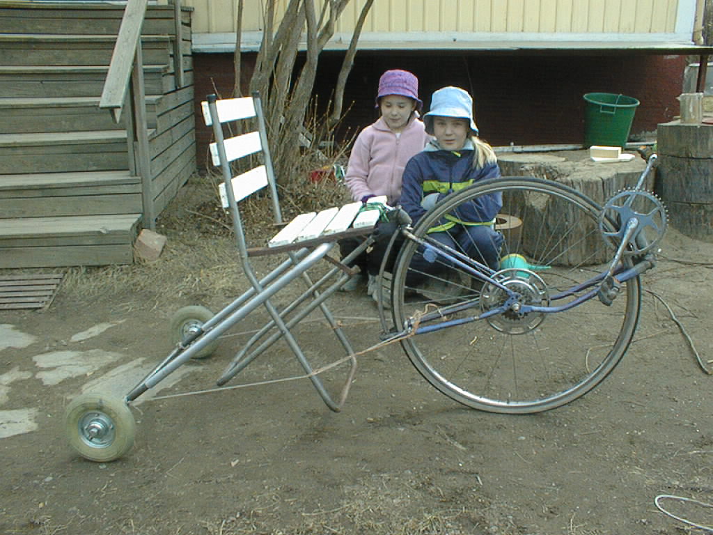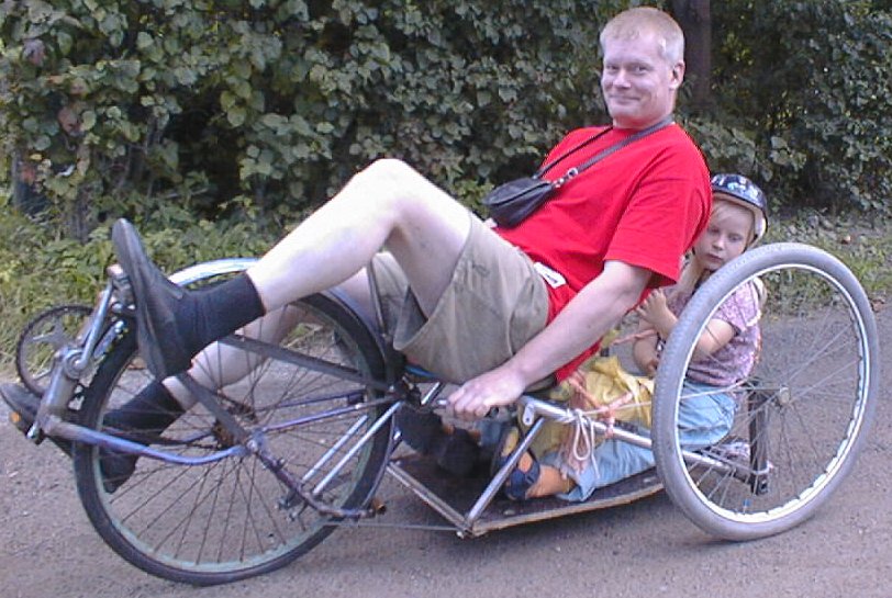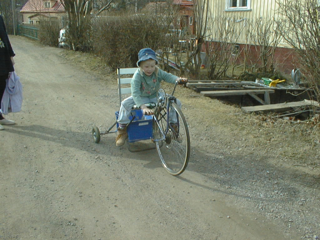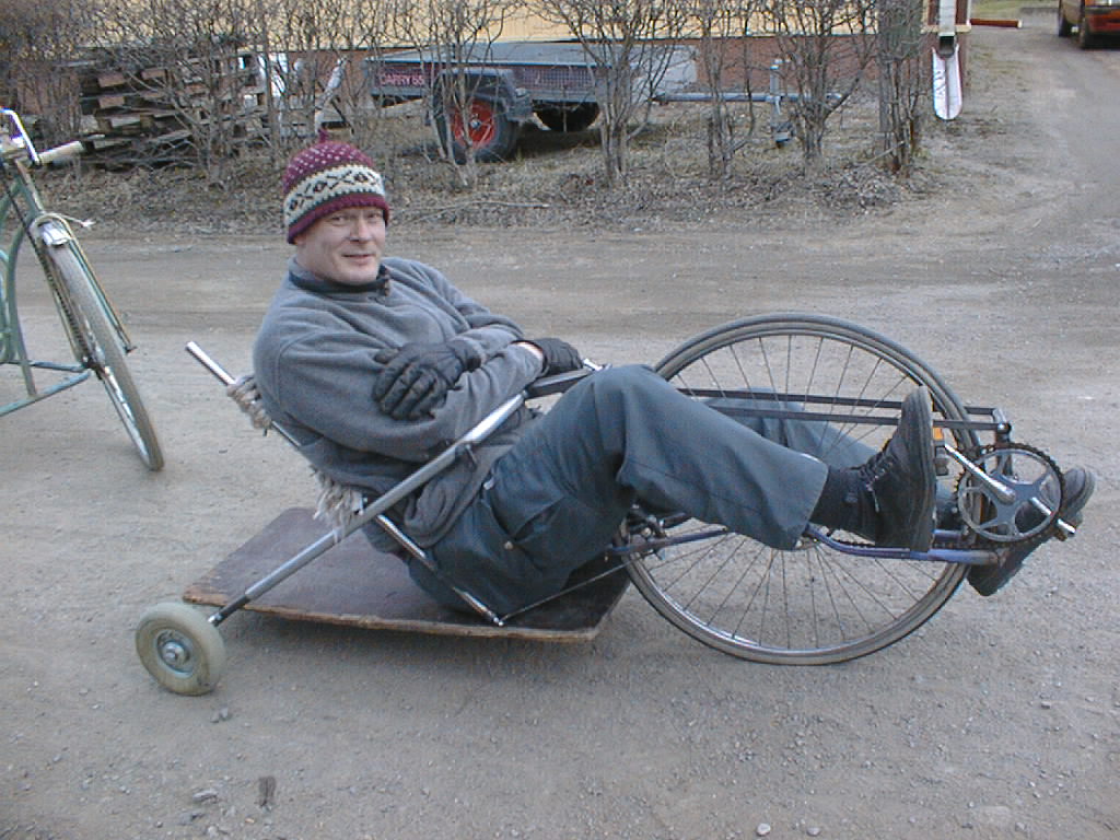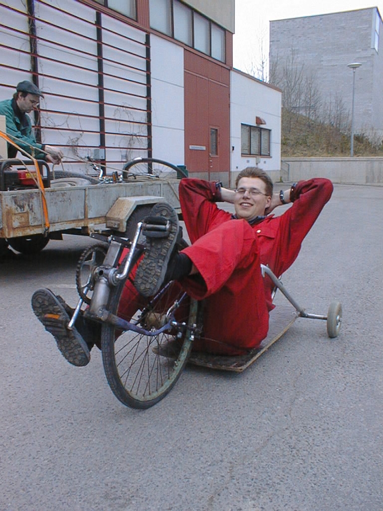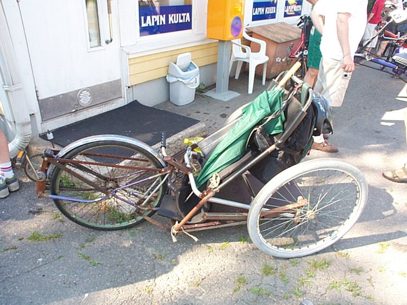 Rakensin sille runko-ohjatun virtuaalinivelellä varustetun etuveto deltan. No, siinä rakentamisessa meni kuitenkin niin kauan, että iskias ehti parantua ja pyörä jäi minulle. Se oli siihen aikaan erinomainen väline kuljetella kakaroita uimarannalle, päiväkotiin tai viimein kouluun.