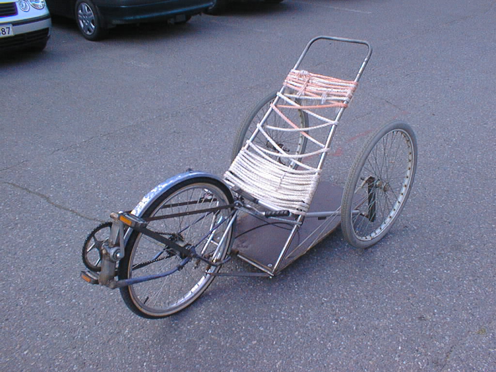 Tuotekehitystä: Vanerilevy pohjaksi ja tavaratelineeksi, vaihdetaan narut lattaraudaksi sekä lisätään selkänojaan pehmusteet. Vetohaarukkamoduulin asentoa voi säätää eri kulmiin polkijan jalkojen pituuden mukaan.