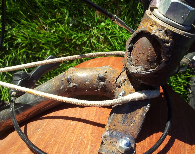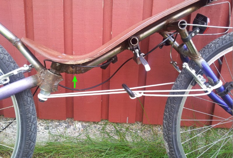 Otin kuvan josta näkyy miten naru on nyt. Yksi naru, neljä solmua Piti laittaa siansorkka pultin ympäri ettei naru putoa itsestään. Vielä ei ole pelkoa, koska nivel on edelleen niin jäykkä ettei siihen tule ulosjoustoa pyörää nostaessa. Nuoli merkkaa rungon jatkamispaikan.Nyt siinä on muutaman sentin matkalla viisi hitsaussaumaa Rungosta tuli jämäkämmän tuntuinen. Etenkin jarruttaessa tapahtuva rungon taipuminen vähentyi oleellisesti. Alunperin tuossa oli varmaan esijännitys päälle istuessa, joka katosi jarruttaessa.