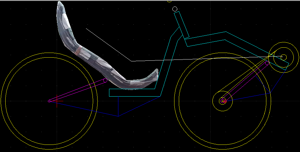 Nyt keulan suunnitelma näyttää tollaselta. Nivel on runkoputken yläpinnalla ja polkimesta polkimeen levee. Se on niin lähellä ketjulinjaa mitä nyt suunnilleen saa. Harmaa ketjulinja pitäs olla pahin mahdollinen tapaus.