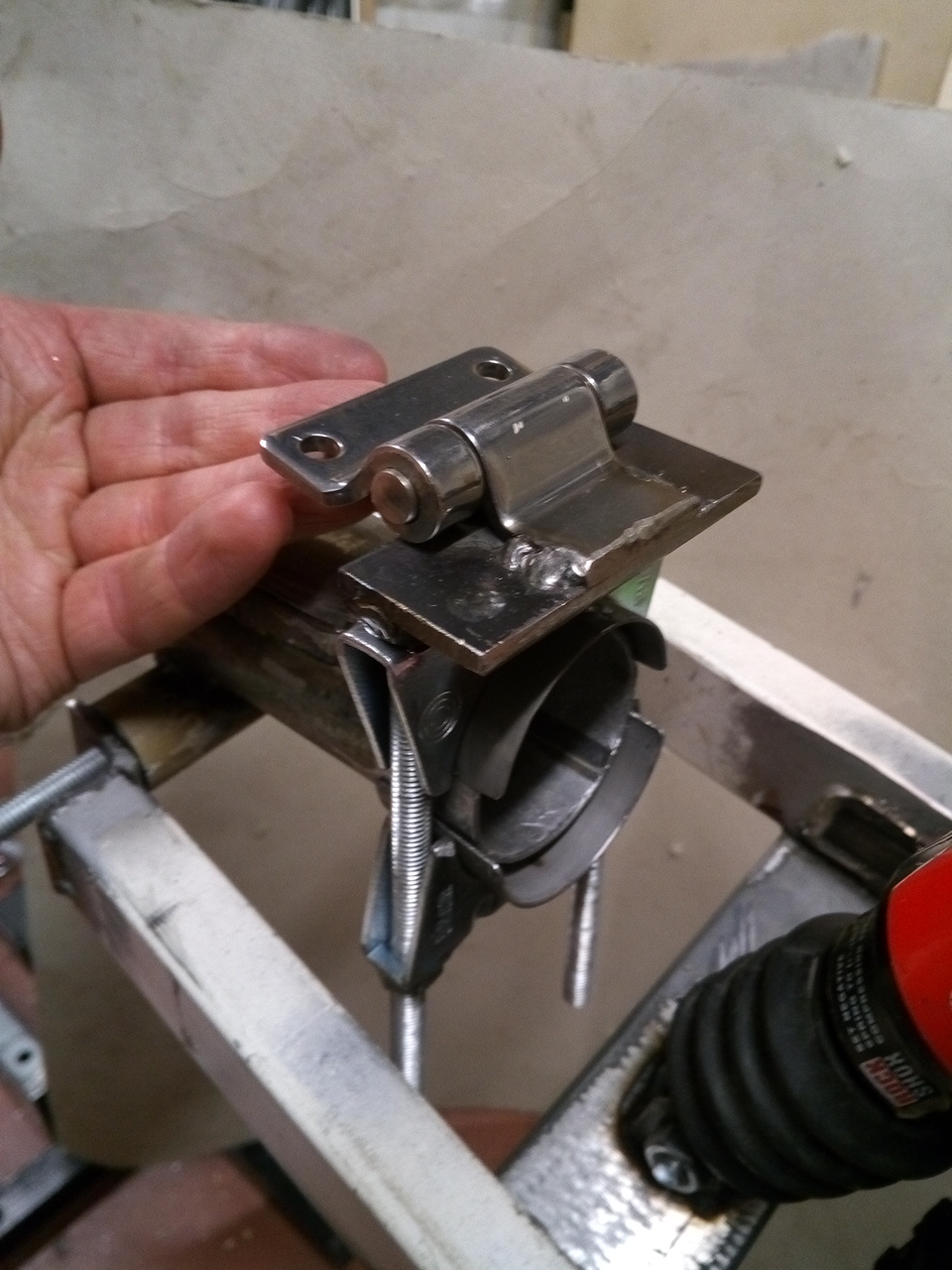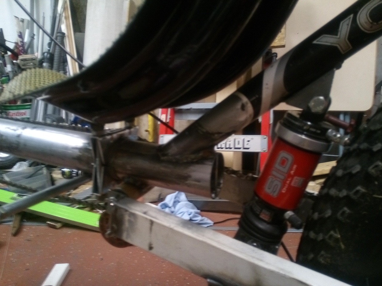 Nyt oli jo liian pimeetä ottaa ulkokuvaa joten tässä ahtaasta tallista. Viistoputki on hitsattu ja siihen pultattu akkukotelo.