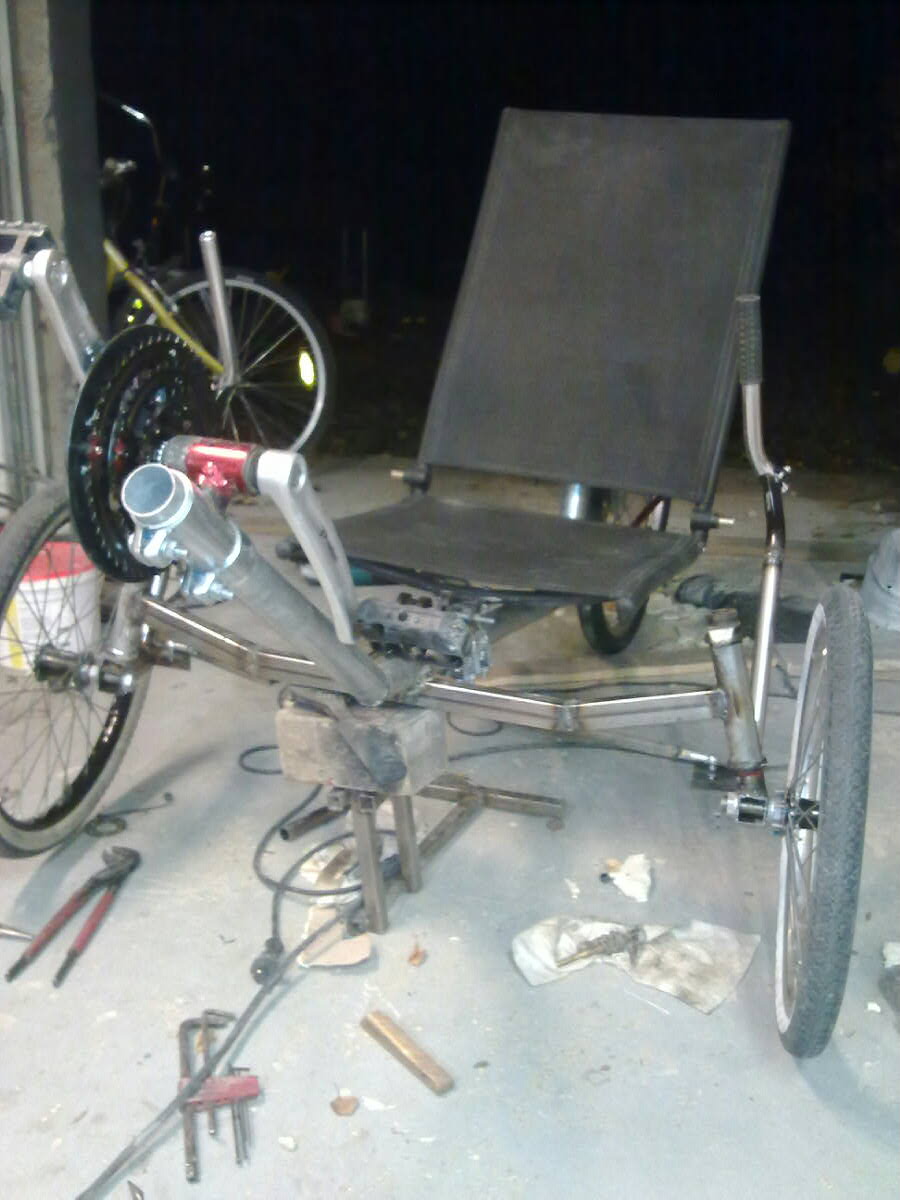 Pitihän sitä pikaisesti kokeilla vaikka jarrut puuttuu kokonaan ja vaihdevaijeri. Tein penkin kiinnityksen taakse täällä annettujen ohjeiden mukaillen uusiksi ja tuli parempi samoin kuin nyt kun kammet on melkein penkin korkeudella. Ohjaussauvoista, on kyllä selkeä ero jos olisivat penkin alla, mutta jotenkin tuntuu käsille luontevammalta. Jos vain lyhentäisin lisäksi kääntösäde pienenisi. Täytyy koeajaa pari kertaa ja kokeilla. Yksi olisi tietysti moottoripyörissä käytetty ohjausiskari tank slapperiä varten tyyppinen ratkaisu.