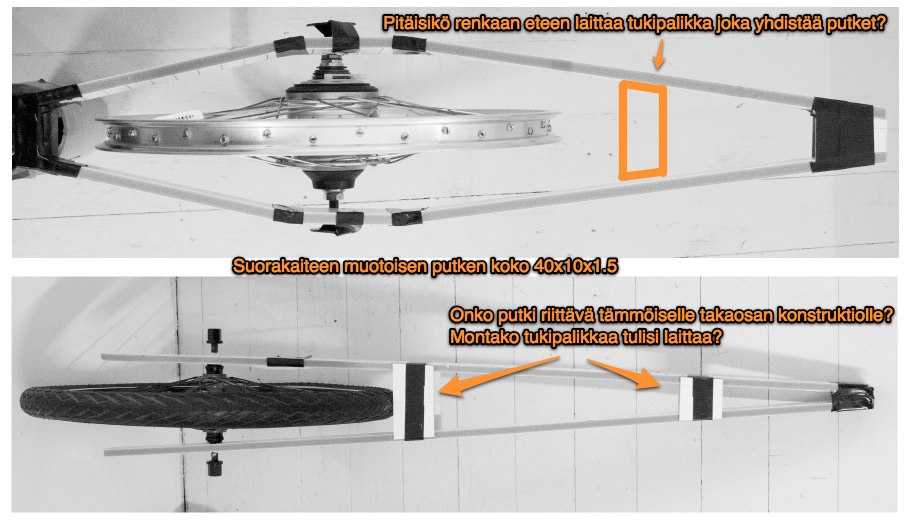 Periaate: Sama materiaalimäärä = paino yhdessä putkessa antaa paljon enemmän jäykkyyttä kahdeksi putkeksi jaettuun rakenteeseen verrattuna laittoi välitukia tai ei. Minä tekisin minimaaliset haarukat ym. kaksihaaraiset osat ja kaiken muun yhdellä putkella.