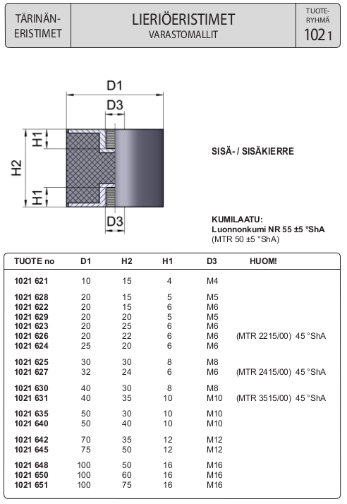 Pysäytin kumia en ehkä ekassa vaiheessa kokeilisi, mutta esim Trelleborgin HK60-40 tai HK60-50 eristin vaikuttaisi mielenkiintoiselta, jos sellaisen saa jotenkin kiinni rakenteeseen. Perusteena mm. sivuttaisjäykkyys.