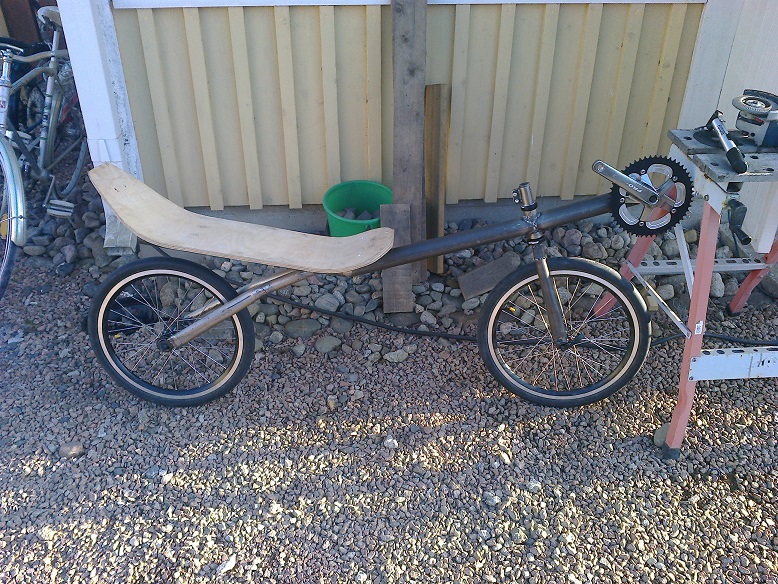 Tarkoitus rakentaa täysiä-pyörä ilman mitää ylimääräästä. Osia löytyy jo omasta takaa (aivan liikaa), esim. epäonnistunut vaneripenkki toimii tähän täydellisesti kun tekee olkapäille "stopparit"