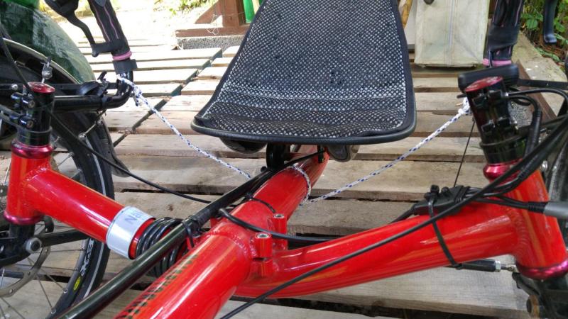 Tähän ansaan menevät kyllä ammattimaisetkin kolmipyörän valmistajat, mutta tässä erityisesti on tehty suora ohjaus erittäin pitkillä ja painavilla ohjainvarsilla, jotka siirtävät kääntyvän etupyörän osakokonaisuuden painopisteen kauas renkaan nivellinjan taakse ja tekevät ohjauksesta tästä syystä yliohjaavan ja varsinkin käsivarsien painolla lisättynä rauhattoman ajettavan. Vähänkään pidempivartinen suorahohjaus vaatii ohjausvaimentimen. Toinen vaihtoehto on painopisteen kannalta hallitusti tehty epäsuora ohjaus. Suora ohjaus on kuitenkin korjattavissa käyttökelpoiseksi lisäämällä ohjausvaimennin, joka on helpoimmillaan mahdollista tehdä narusta. Laita Risto kuva siitä, kun näet tämän viestin.