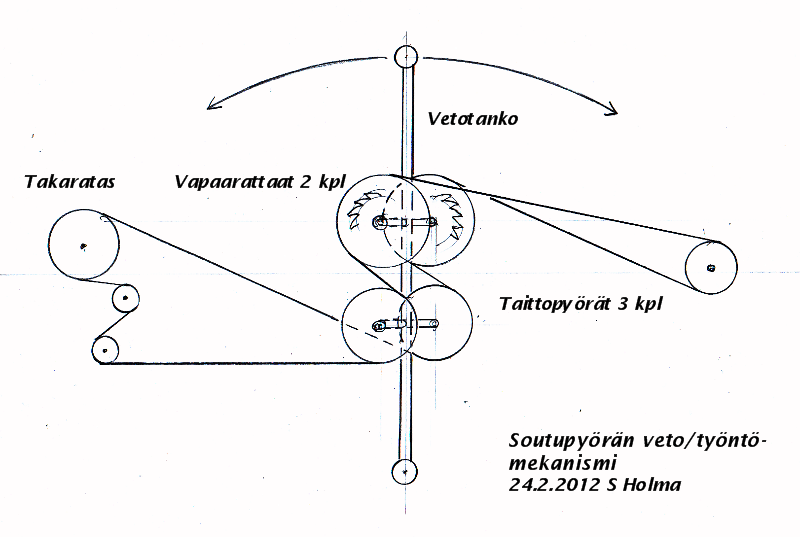 Mielenkiinnolla seuraten. Ihmettelinkin aiemmin rataspakkaa, mutta kyse oli vissiin lainatusta vapaarattaasta. Aiemmin pidin itsestään selvänä, että lyhyemmällä varrella oleva työntörissa olisi välitykseltään kevyempi. Jos näin on käytännössä, olisi siinä avain portaattomaan välityksen säätöön, kun rissoja voisi liu'uttaa vetotangossa. Mutta se on toisen kehitysvaiheen asia.