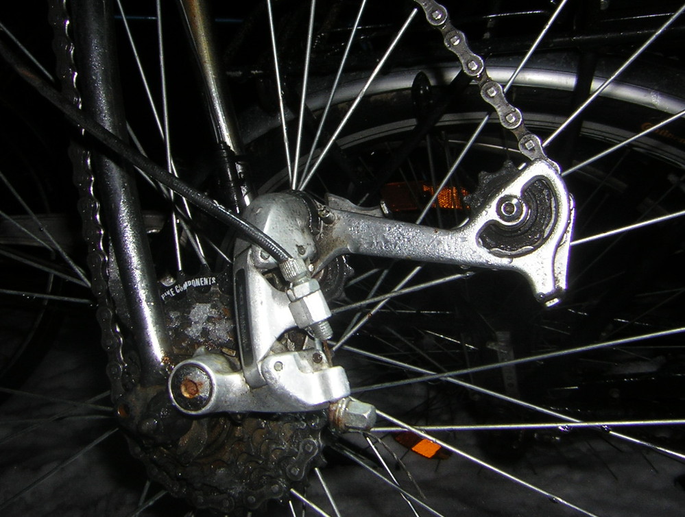 Vieläkös sinulla on se u-mutka vaijerissa. En löytänyt vaihdevaijerin invertoinnista kuvaa lyhyellä etsinnällä, niinpä kävin pyörävarastolla (tuolla puun alla pihalla) kuvaamassa invertoidun vaihdevaijerini. Siinä vaijerin kiinnityspultin paikalle on kierretty sivuvetojarrun vaijerikuoren kiinnityshelat ja vaihdevaijeri on vedetty läpi vaihtajan vaijerikuorenkiinnityshelan reiän läpi ja laitettu vaijerin päähän pelkkä reiällinen kiinnitysruuvi muttereineen. Eihän se hieno ole, mutta toimii myös pakkasella.