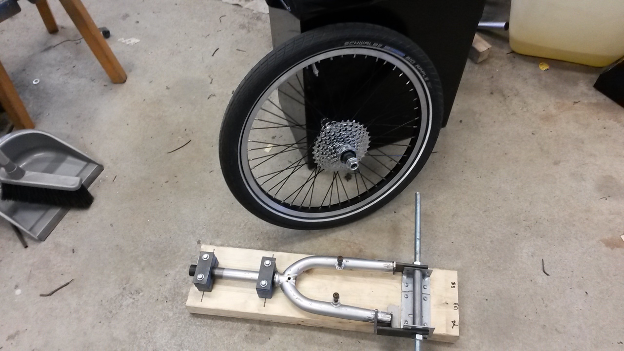 Ettei ihan virtuaalirakenteluksi mene, niin kiekkoon kumi ja rataspakka paikoilleen sekä etuhaarukalle jigi ja dropparit valmiiksi. Hitsausta vaille.