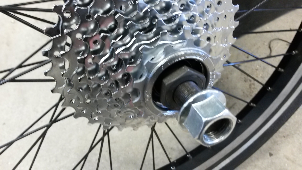 Bmx kiekossa on 24mm avainvälillä oleva laakerin kiristysmutteri, joka ei mahdu vapaarattaan sisälle. Katkaisin 20x2,5mm putkesta 23mm pitkän pätkän, jotta kiristysmutterin saa vapaarataspakan ulkopuolelle. Navan kokonaisleveydeksi tuli 133mm. Haarukasta pitää tehdä epäsymmetrinen.