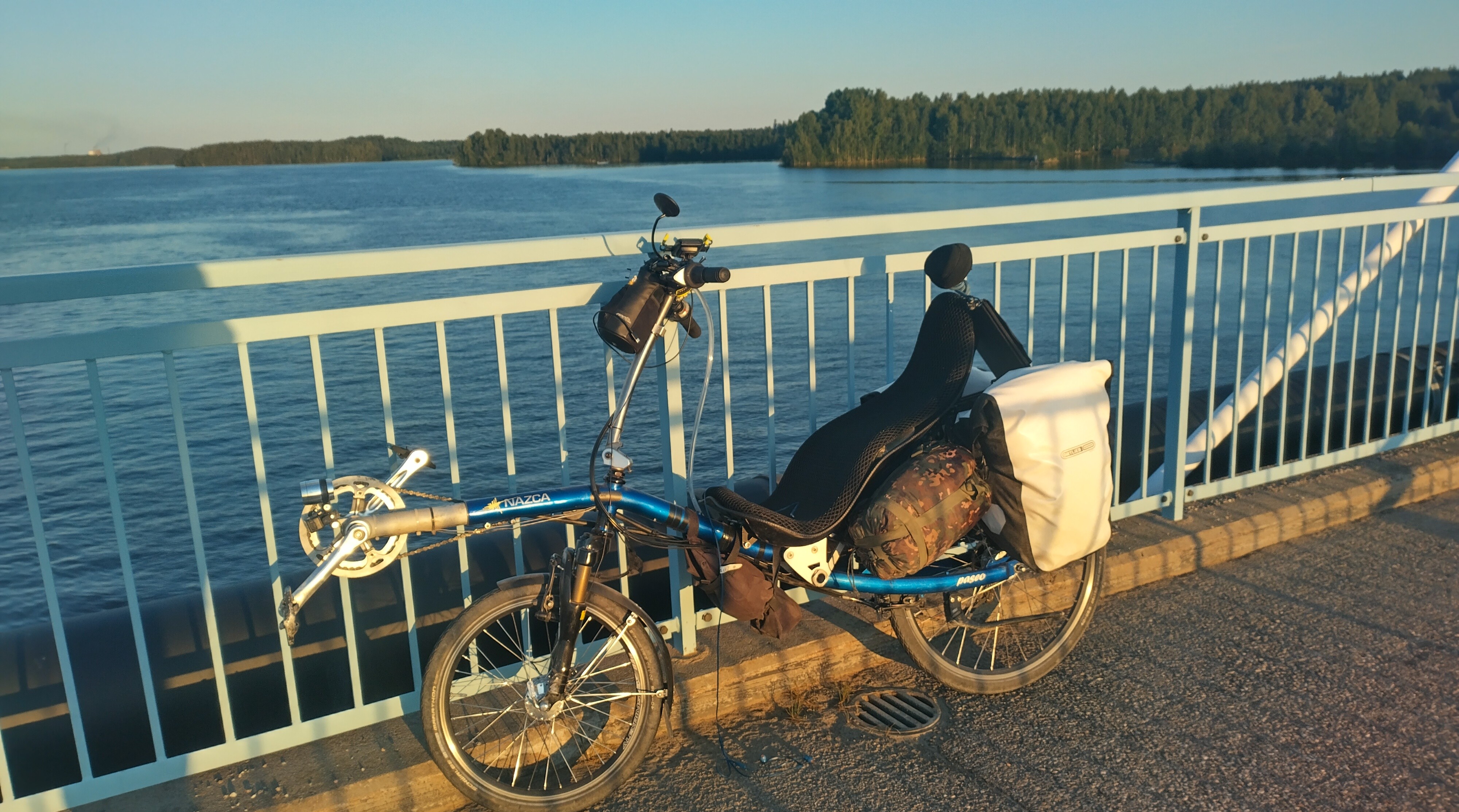 Muutin vähän suunnitelmaa ja ajelin Haaparannan kautta Suomen puolelle. Olin siinä kahden vaiheilla, että mihin suuntaan lähdetään, ja päädyin vaihtoehtoon B, eli lähdin lätkyttelemään pieniä teitä pitkin kohti Kittilää. Illalla väsyneenä poikkesin hyvin epämääräiselle pikkupolulle etsimään riippumatolle paikkaa ja humps taas oltiin kyljellään. Ohjausvarsi vääntyi lisää ja hitsisauma murtui. Onneksi ei irtipoikki, vaan neljästä saumanpätkästä yksi antoi periksi. Sen verran kiero on jo tuo puikko, että en enää uskalla kokeilla paljonko se kestää kuritusta.