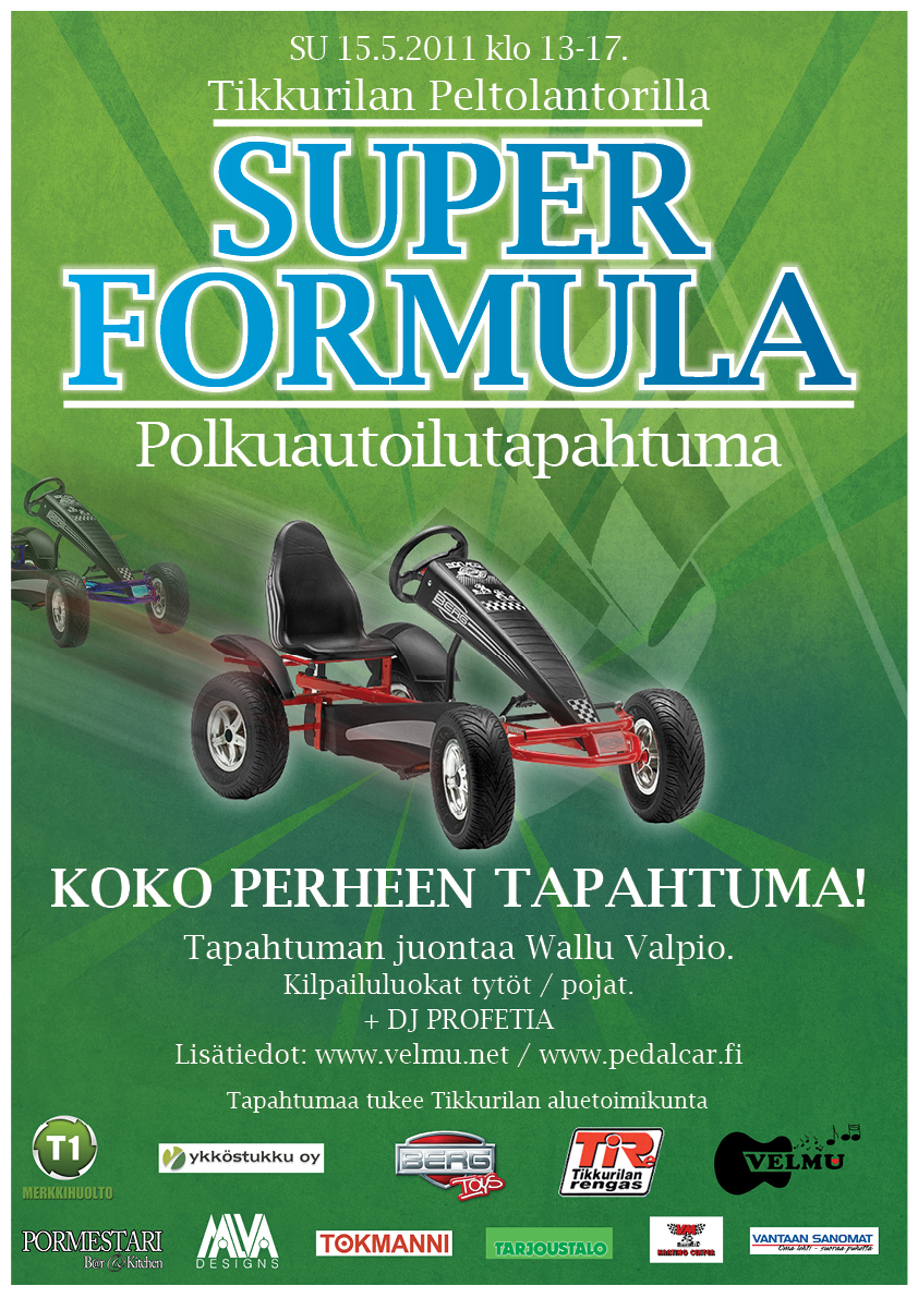 Kisan pituus ratkaisee, kuinka monta starttia voimme järjestää (n. 4h ).. Jos nojakkeja tulee mukaan esim: 30-40 kpl, niin silloin meidän pitää järjestää 2 karsintaa + finaali. Lapsille tietty polkuautot yritetään vuokrata, kunhan sponssei vain saadaan, eli kiirusta pitää http://www.vuokratori.fi/service.cntum?pageId=121448