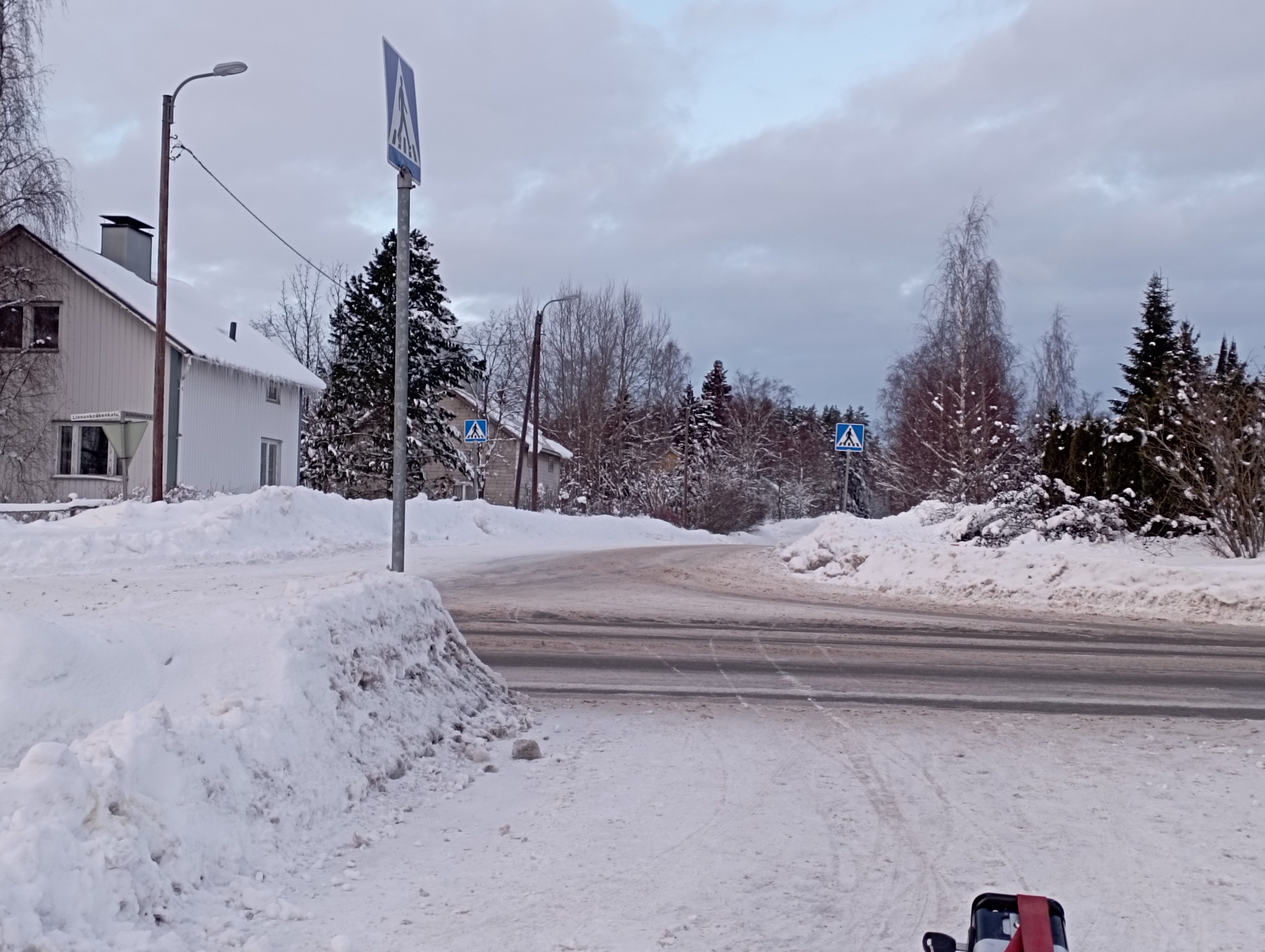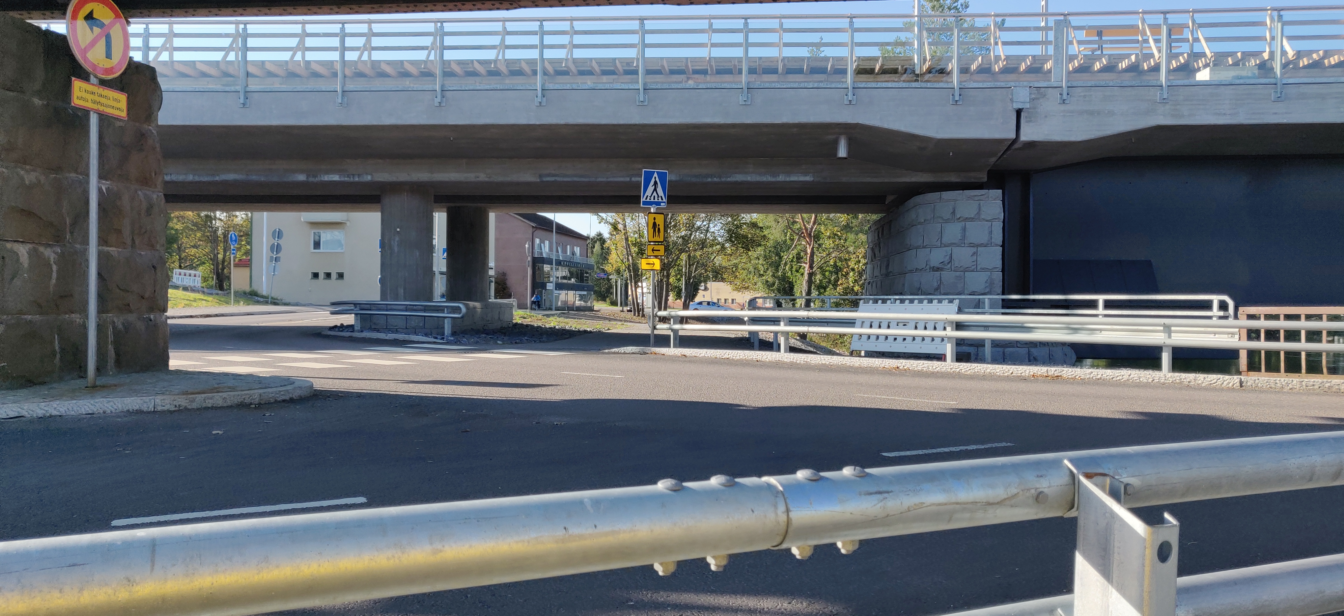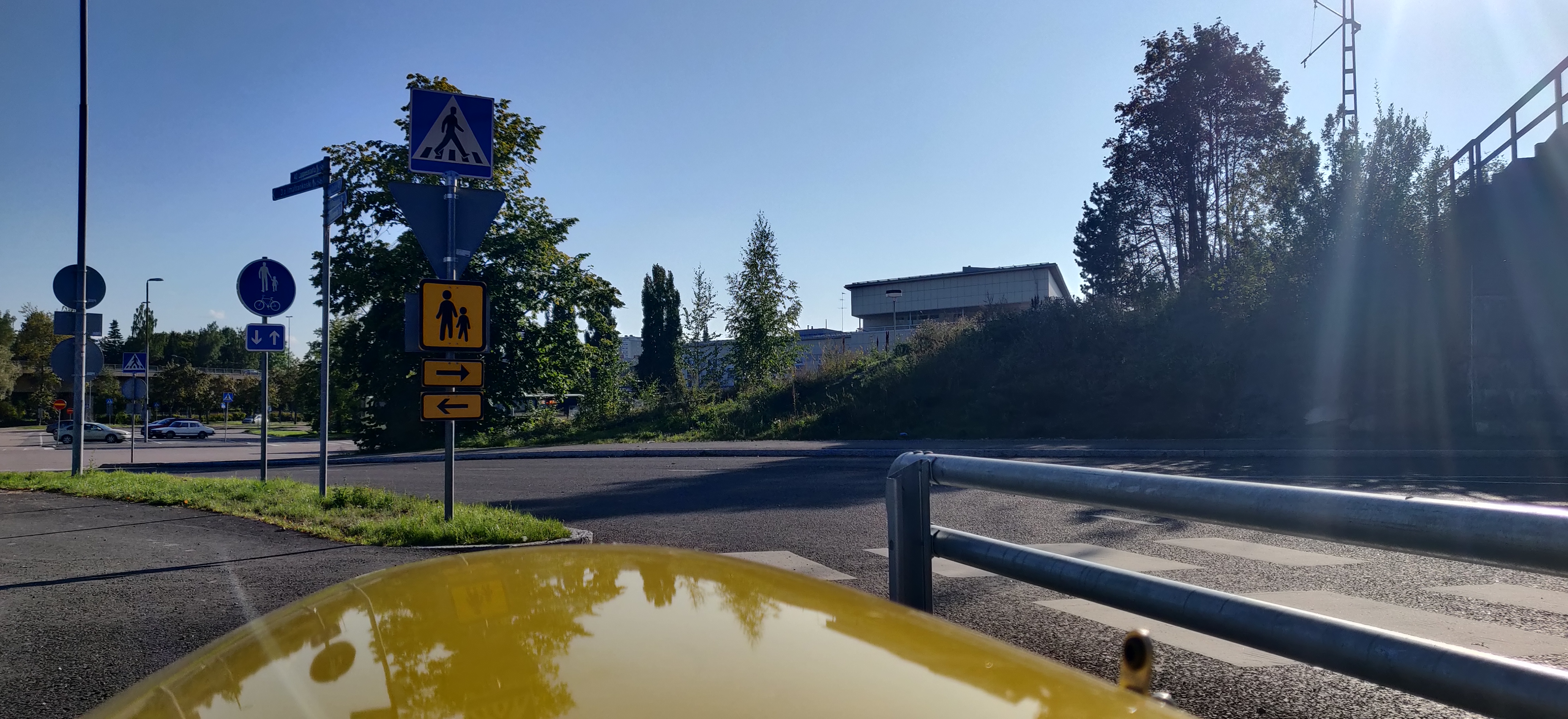 Kuva siis otettu kevarilta ja tuolla risteävällä tiellä on suojatien merkit. Tien kummalkakaan laidalla ei oo kevaria, ei ees jalkakäytävää. Ymmärrän, ett se on laitettu siihen ohjaamaan kävelijöitä, ehkä myös pyöräilijöitä ylittämään tie ennen risteystä josta pääsee toista suojatietä kevarilla. Varsinkin pyöräilijöille vähän erikoinen paikka ajaa taas järkevästi, tuolta vastakkaisesta suunnasta tullessa ![]()