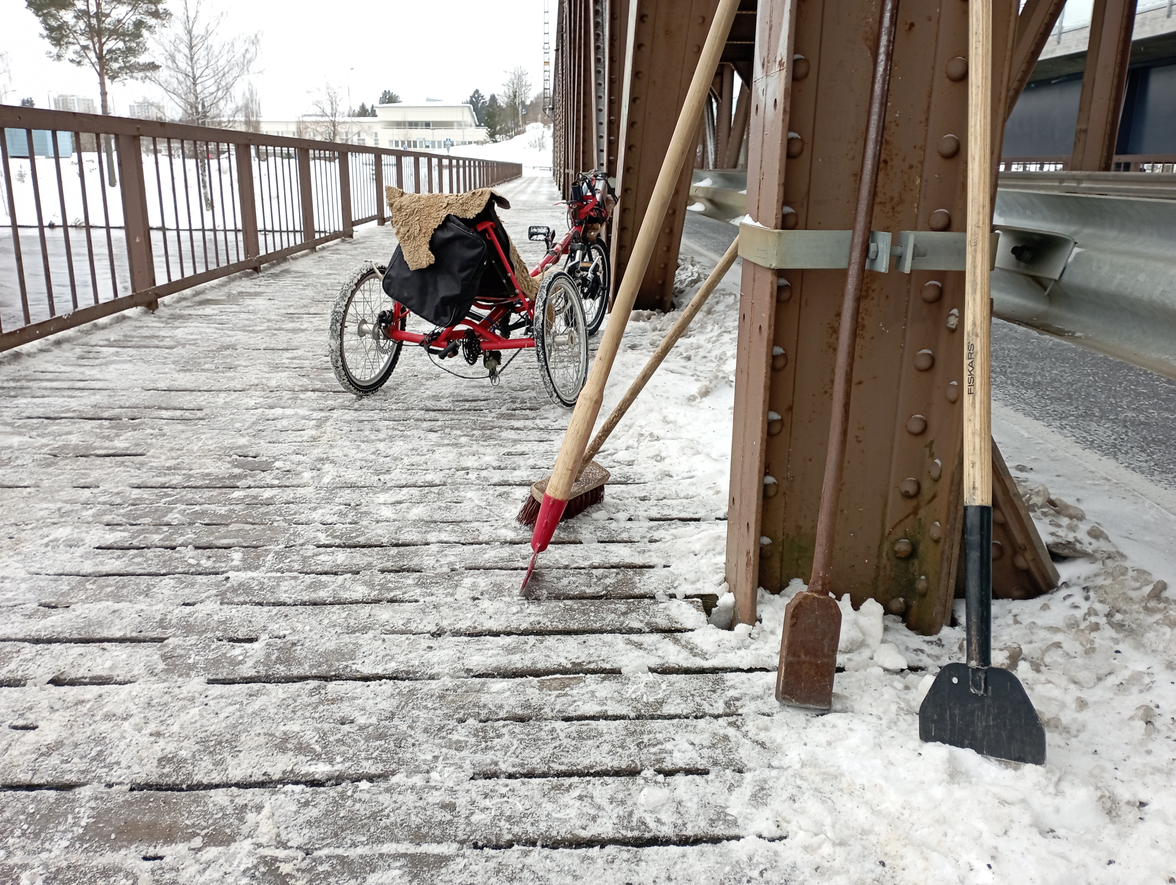 Tämä Mansikkalan ratasilta, Imatralaisittain Mansikkalan vanhasilta on tässäkin ketjussa vilahdellut ennenkin. Alkutalvesta paikallislehdessä juttua sillan kevarin huonosta talvikunnossapidosta, kommenttiosiossa ehdoteltiin kolaa ja lapioo. Ilmeisesti kaupungininsinööri otti neuvoista vaarin koska silta on ollut paremmassa kunnossa ja usein oon sillalla nähny työntouhussa yhen tai kaks tyyppiä. Olivat kai ruokiksella kun otin kuvaa.