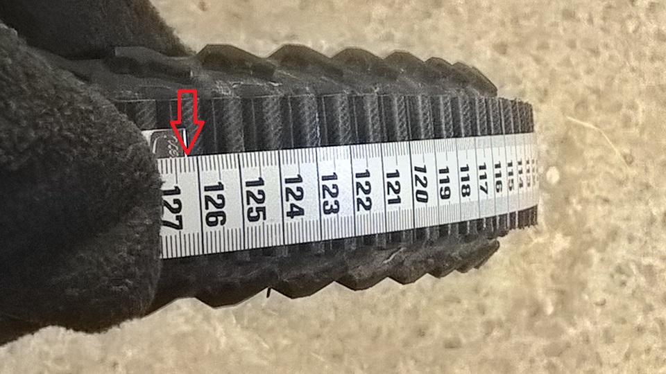 Tässä on mittaustuloksia. Hihnan sisäkehämitta olikin vaikeampi mitata. Karkeasti mitattu halkaisija on 385 mm, eli kehä 1210 mm. Toisin laskien ulkokehä 1262/pii - 2 x 5,7 (hihnan paksuus) = 390,3mm --> kehä 1226 mm. Ero johtunee ainakin osin hihnan keskeltä pullahtamisesta kaarevaksi paineen vaikutuksesta.