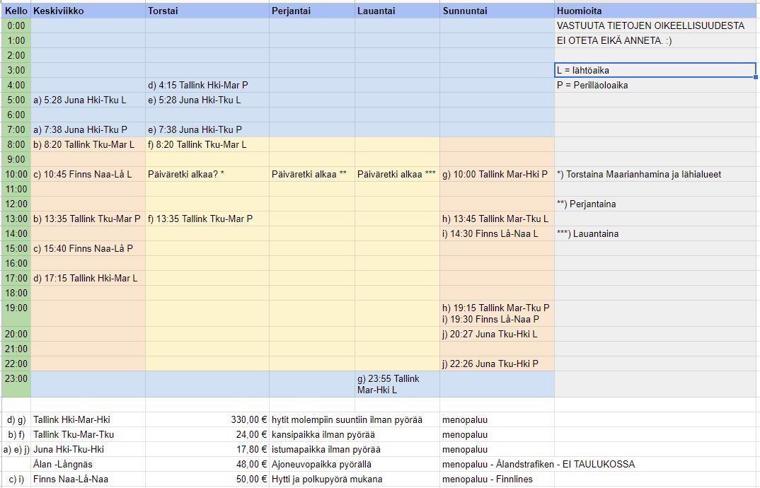 • Laivallla Helsingistä Maarianhaminaan (perillä 4:15 jos aikataulussa) - katsottu Tallinkin hintoja 9.2.2020 > 175e halvimmalla hytillä ja yhdellä polkupyörällä yhteensuuntaan