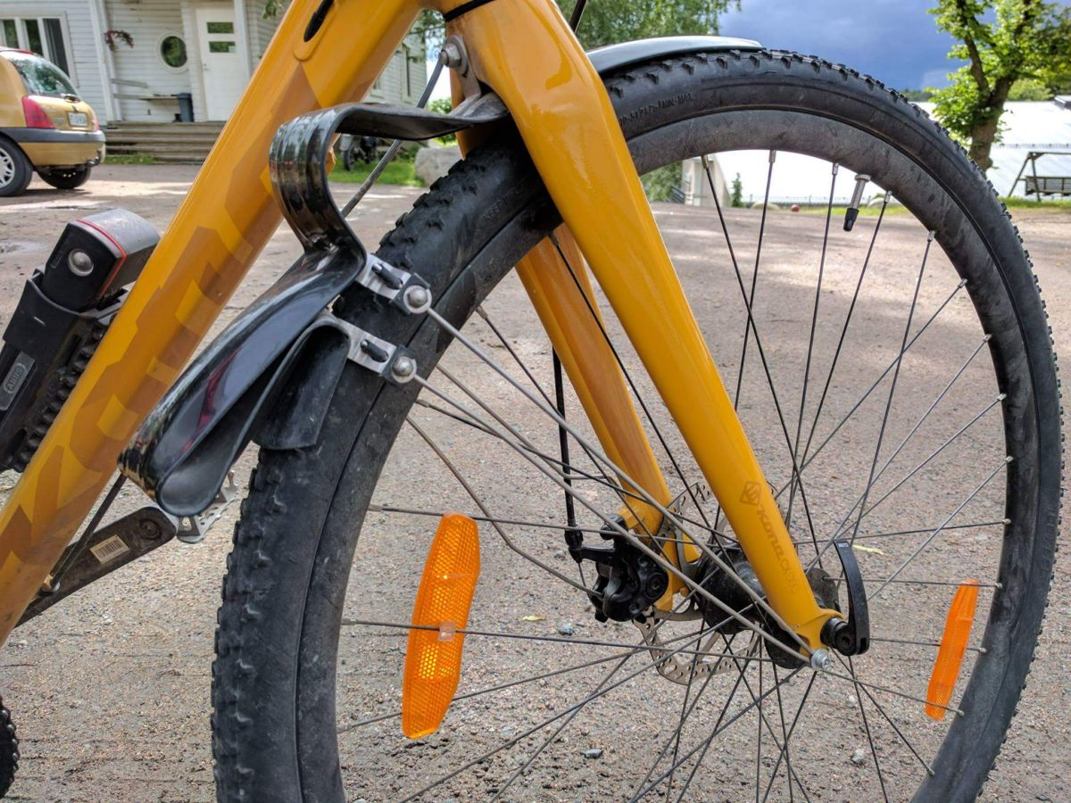 Jos ei ole etulokaria tai se on lyhyt, kannattaa asentaa niin pitkä lokarin kiinnityspyltti että se tulee jarrun yhdysvaijerin alle. Jos pitkä vaijeri katkeaa/irtoaa, ei yhdysvaijeri pääse putoamaan renkaaseen kiinni aiheuttamaan leppäkeihäs-ilmiötä.