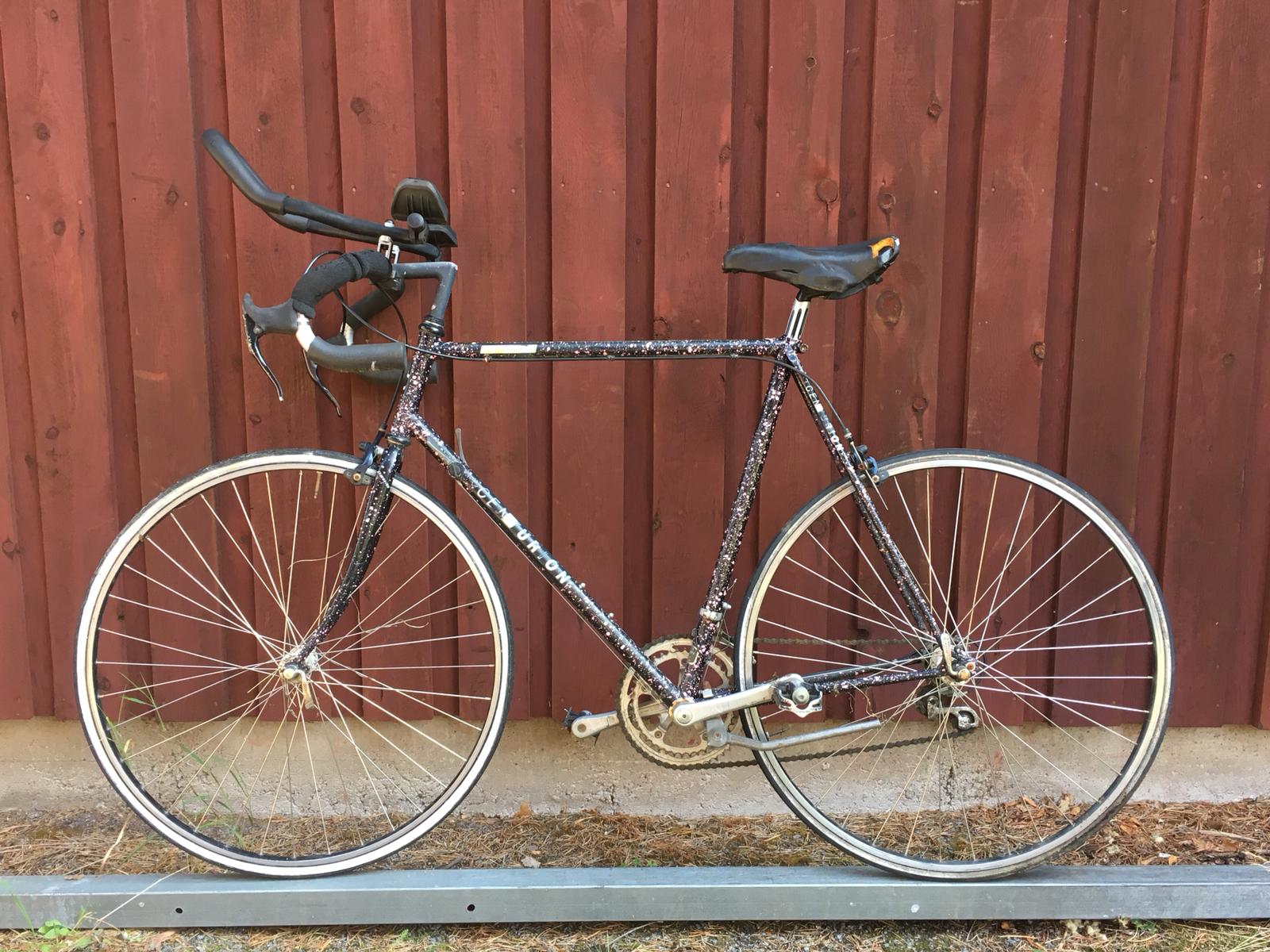 Centurion Super Le Mans. Ollut vuosia ulkona, eturenkaaseen kesti laittaa ilmaa, mutta takarengas lähti repeämään, eli koeajolle en vielä päässyt. Etuvaihtajan vaijeri poikki, takavaihtaja toimii. Koko voimansiirto likaa lukuunottamatta kuin uusi Satulaputki jumissa, mutta tuntus että on aika liki sopiva mulle. Ei oo paljo ajettu tai on kertaalleen entisöity. Tuollaista maalausta en löytänyt Centurionin pyöristä ja nuo kahvatkin on erilaiset kuin muissa Super Le Manseissa.