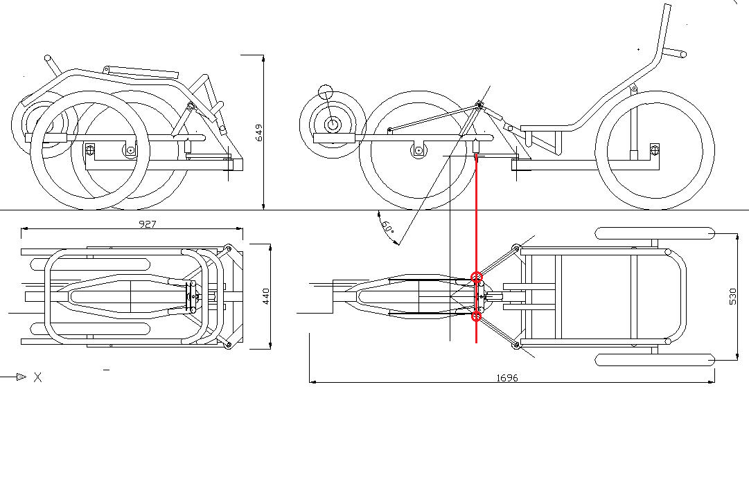 Nuo takapyörien nivelvarsien nivelten sijainti ja kulmikkuus tuo mieleen minun nojapyöräilyni alkuvaiheen ja Iskiaspyörän. Siinä noista kulmissa oli kiinni lankalenkit tai latan pätkät nivelvarren virassa toimien. Ohjausnivelen yläpäänä toimi 8 mm pultti. Ei ollut liikaa klappia ja toimi kevyesti, kun laakeroinnin tukiväli oli suuri. Minun pääni sommittelee tuohon sellaista ohjausta, vaikkei sillä mitään erityistä etua tässä saavutetakaan.